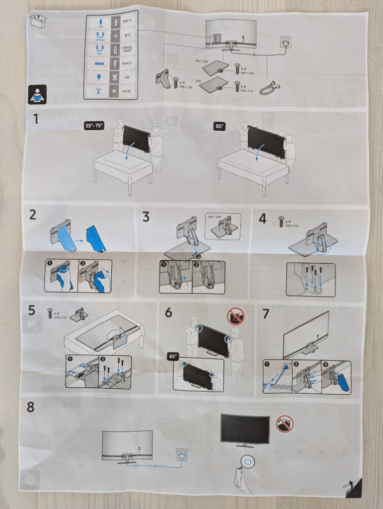 We acquired the stand when we purchased a brand new Samsung 85 inch Smart TV QE85Q80BATXXU. The TV has been mounted on the wall and therefore the stand is not required.