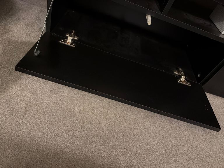 Modern black TV stand in great condition. Gives a clean minimalist look. Features two shelves. No damage. Selling due to moving abroad.