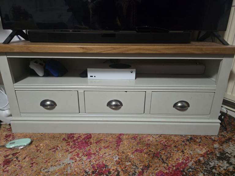 Sleek wooden finish to support a television at an optimal viewing height while often providing storage for media components like gaming consoles, soundbars, and cable boxes. It comes with 3 spacous pull-out drawers for storing various items. This TV Stand is a freestanding, versatile unit that help manage cables and reduce clutter, serving as a functional, space-saving alternative to wall mounting.