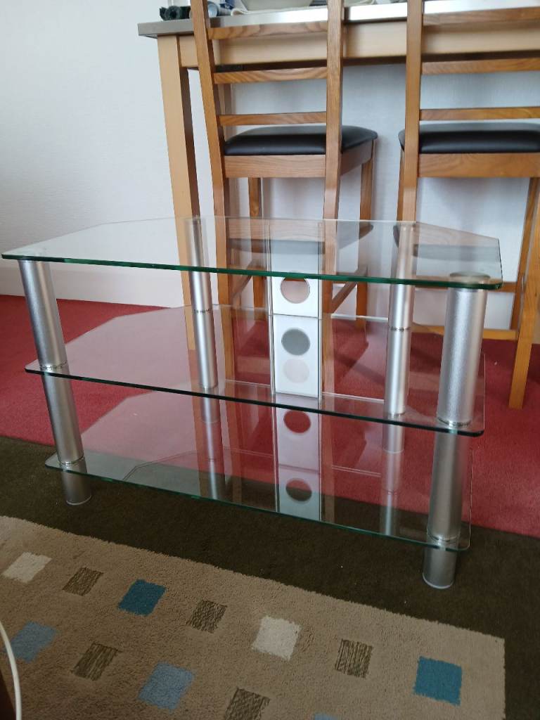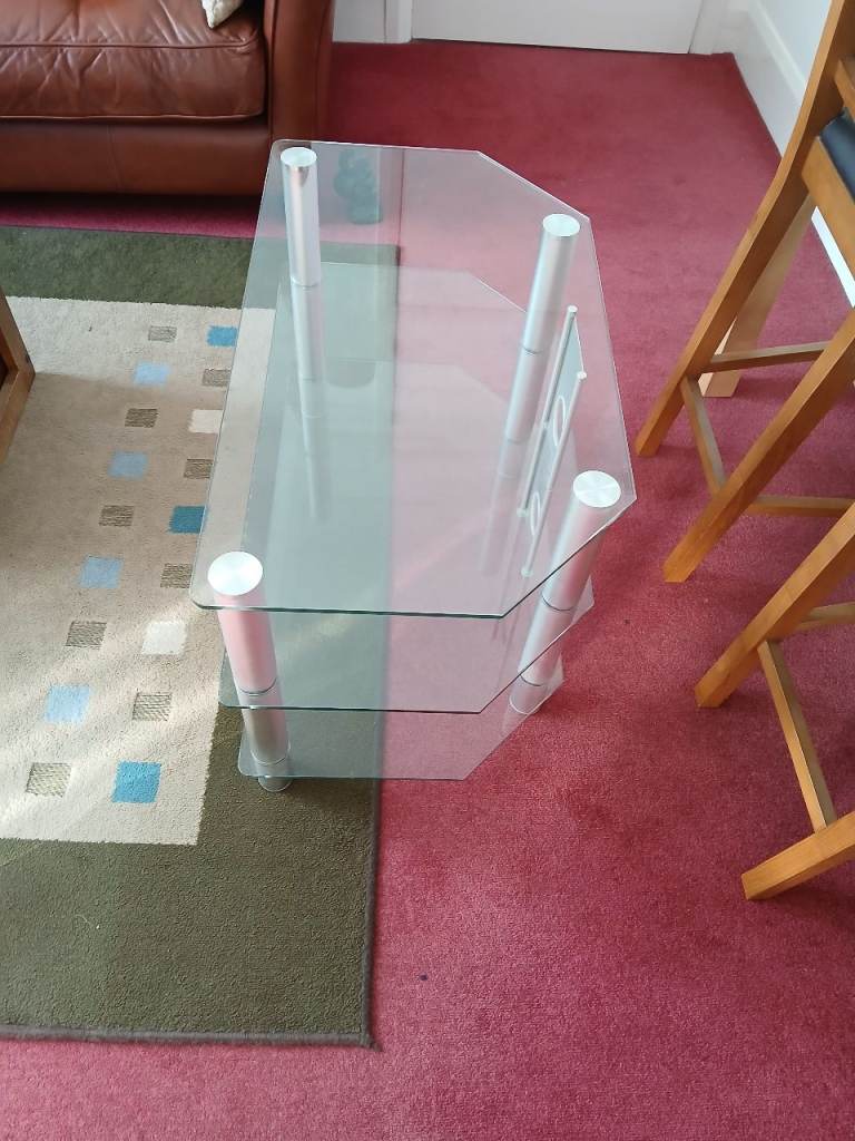 Glass TV stand, been around since the 70's. Tempered glass, three shelves.