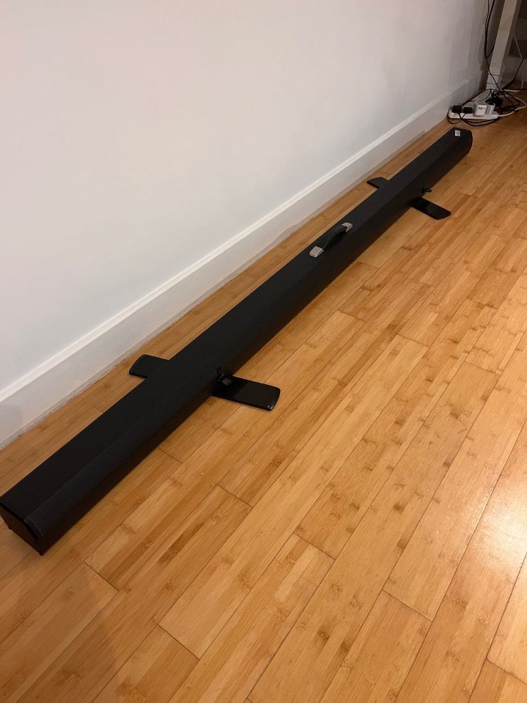 Measurements are 221cm x 125cm and projector screen is standing so no installation required (it pulls up out of the holder on the ground)