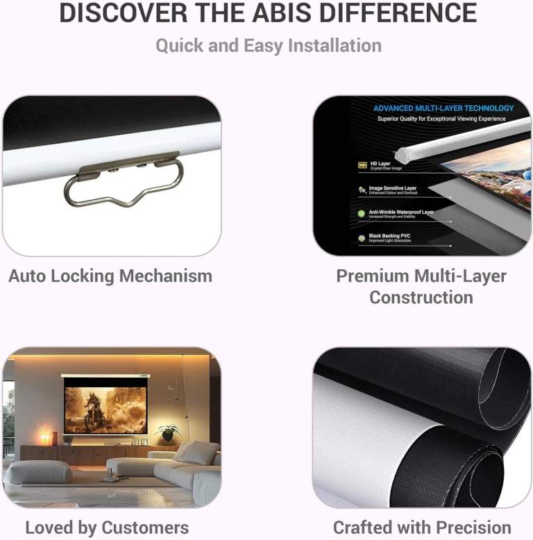 The ABIS 100″ Manual Projector Screen is crafted with premium components, ensuring high performance and durability. This manual screen offers excellent image clarity, making it perfect for home theaters, offices, and classrooms. Its smooth manual operation and high-quality design make it an ideal choice for any setting.