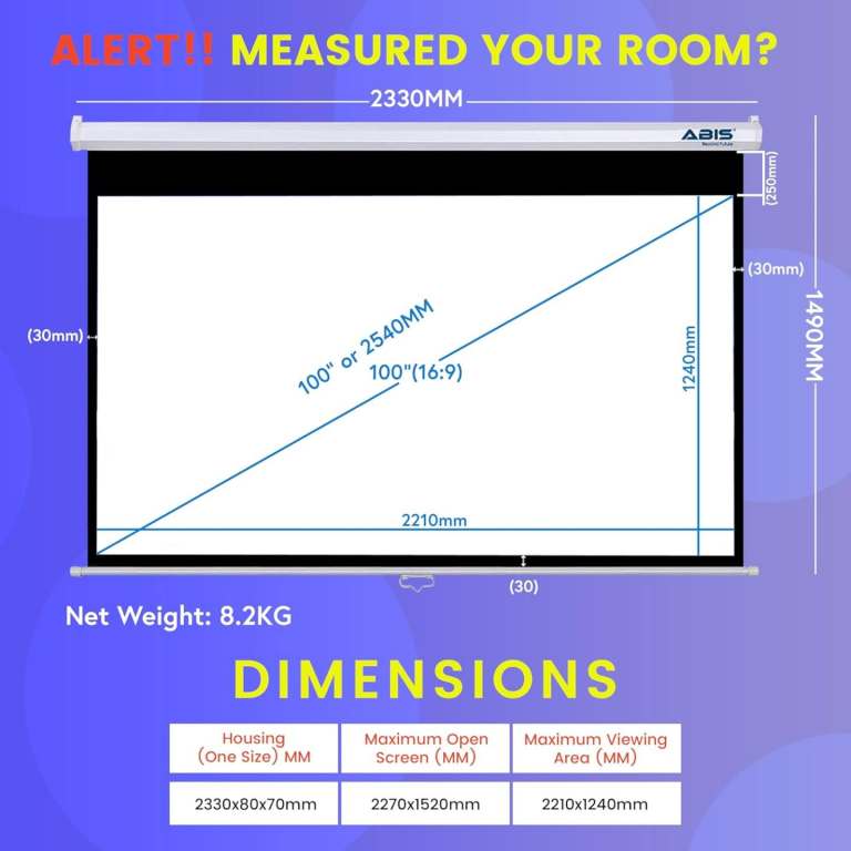 ABIS 100" Projection Screen Manual Pull Down | 16:9 Ratio Matte White Widescreen