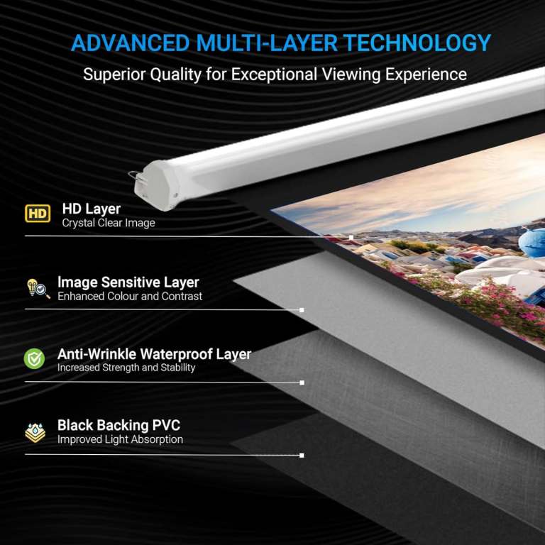 When not in use, the screen rolls neatly into its slim metal casing, which has a white finish that blends seamlessly into most wall designs. The casing protects the screen from dust and damage, ensuring it stays in excellent condition.