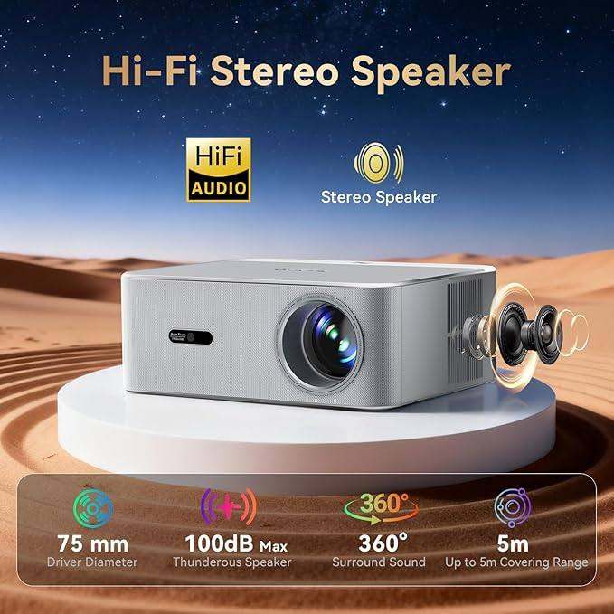 🎬【4K Smart Projector: Cinema-Level Picture Clarity】Experience cinema-grade visual effects with stunning HDR10 clarity, where dark area details are distinct and bright scenes are vibrant. With 1400 ANSI lumens (significantly higher than the few hundred lumens of ordinary projectors), 4K input support (native 1080P output), and a 99% wide color gamut that delivers Hollywood-level colors, it's the perfect match for family movie nights, allowing you to enjoy a visual feast with your family in the living room.