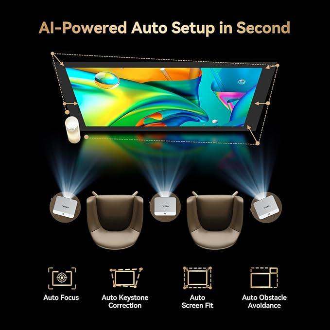 ⚙️【Indoor Professional Picture Quality: Adaptive Adjustment】No manual adjustment needed! Simply place this smart projector anywhere and it automatically achieves: Auto Focus - readjusts a clear picture within seconds after impact; Auto Keystone Correction - automatically corrects tilted images; Intelligent Obstacle Avoidance - avoids objects like clocks or photo frames; Screen Adaptation - precisely aligns with projection screens; Digital Zoom - 50% to 100% seamless scaling. Supports various installation methods including desktop, tripod, and ceiling mount, with no worry about movement during viewing.