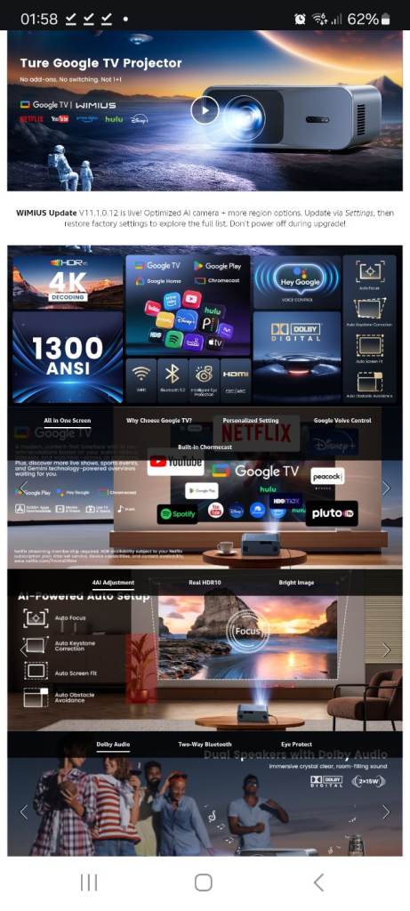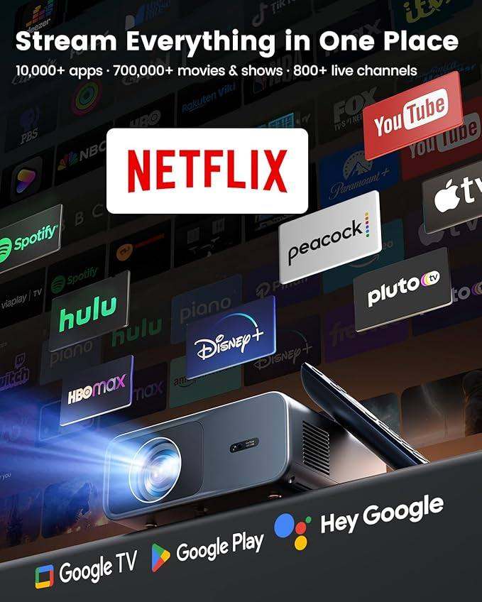 🌟【Exclusive Collaboration WiMiUS G1 × Official Google TV × Netflix with High Memory】 WiMiUS G1 Smart projector comes fully integrated with Google TV—no website version, no stripped-down system, no mouse operating, not a 1+1 Dongle Google TV. Access official apps like Netflix, YouTube, Prime Video, BBC NEWS, Disney+, Prime Video, etc., and 800+ live channels. No need to jump between apps with the home screen. With 16GB of storage, there's even more room for your favourite apps. Twice the memory of other projectors for reliable streaming.