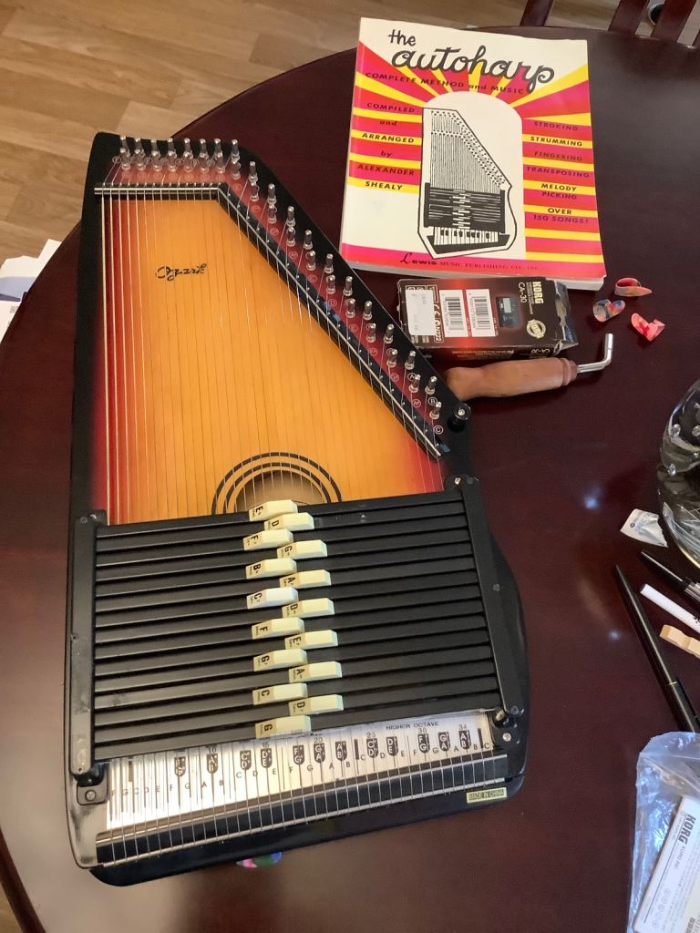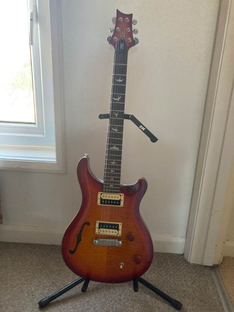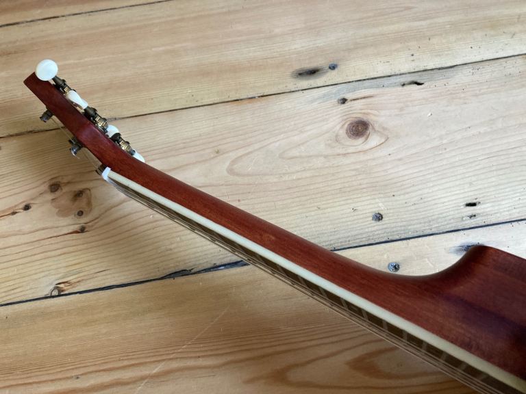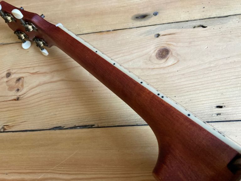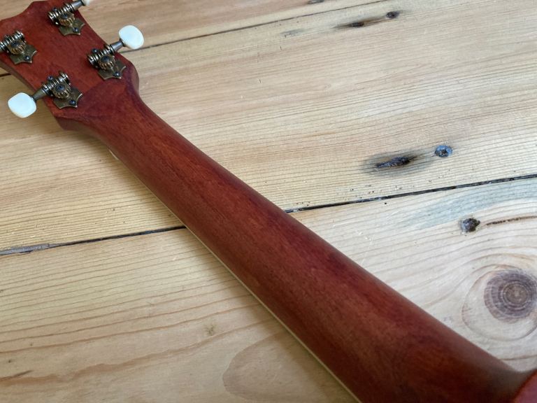 It has a pretty headstock shape and dot fretboard inlay and a screwed on back. It plays nicely and the strings are in good shape (may require further stretching in).