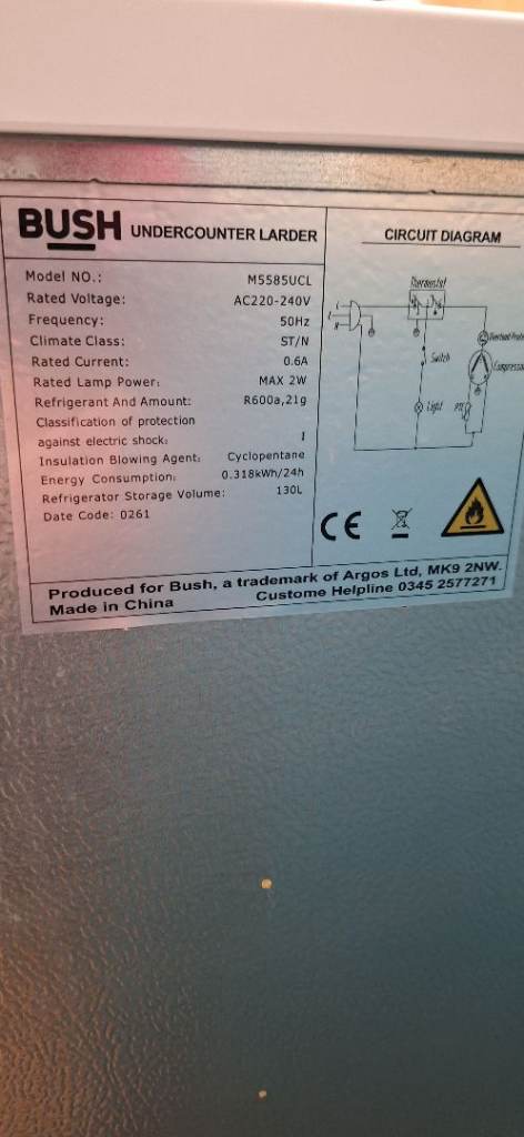 Bush under counter fridge, in good condition,and working order, model number: M5585UCL