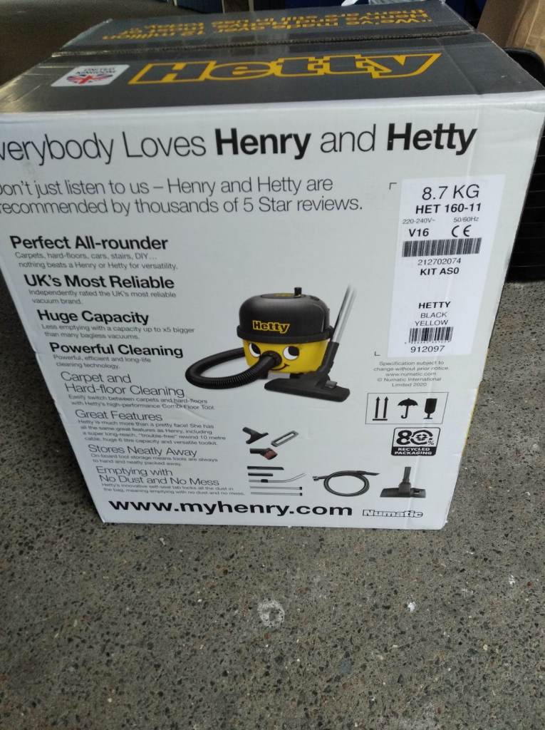 Box contents: - Numatic Hetty HET.160-11 Cylinder Vacuum Cleaner; - Accessory kit; - Dust bags x 2