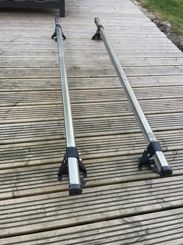 Pair genuine Rhino roof bars, used, complete with fittings. Suitable for new type Vivaro/Dispatch/Expert/Proace etc.
