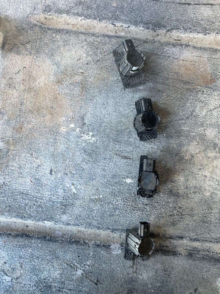 Two black and two white (with paint chips) Parking sensors off a front bumper of a 2019 Ford Custom Transit