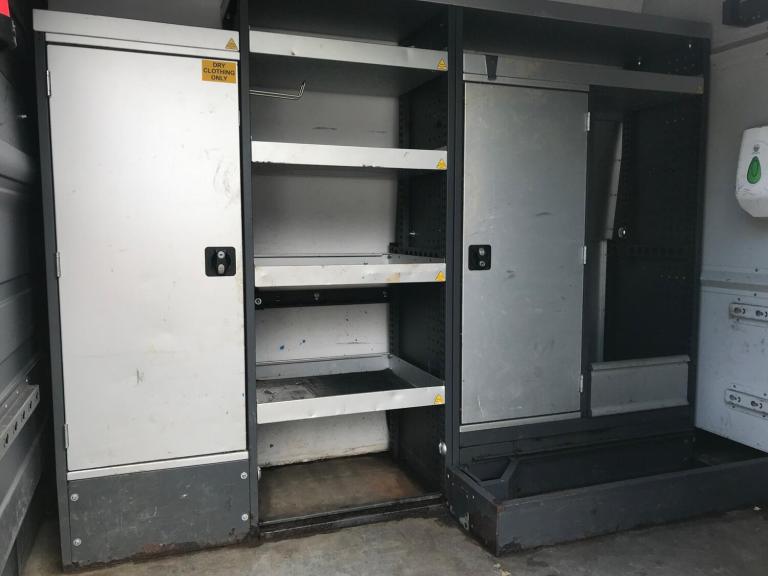 A 5 TONNER DOUBLE WHEELER, LONG WHEEL BASE HIGH ROOF ,OWNED BY SCOTTISH WATER FROM NEW WITH A MOBILE WORKSHOP AND LOTS OF RACKING IN THE LOAD AREA