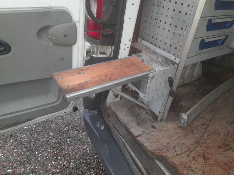 Shelved for tools in back fold down work bench