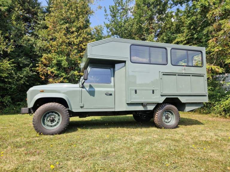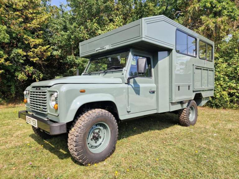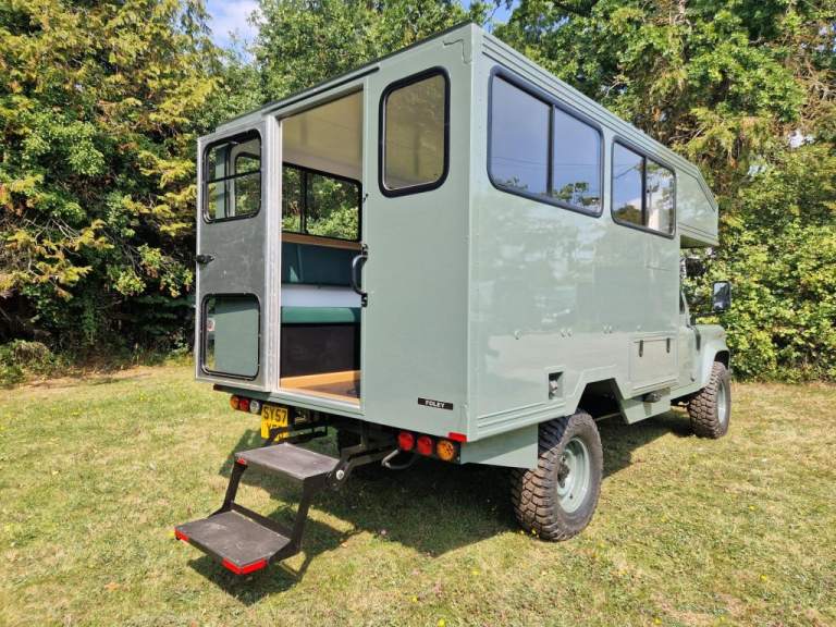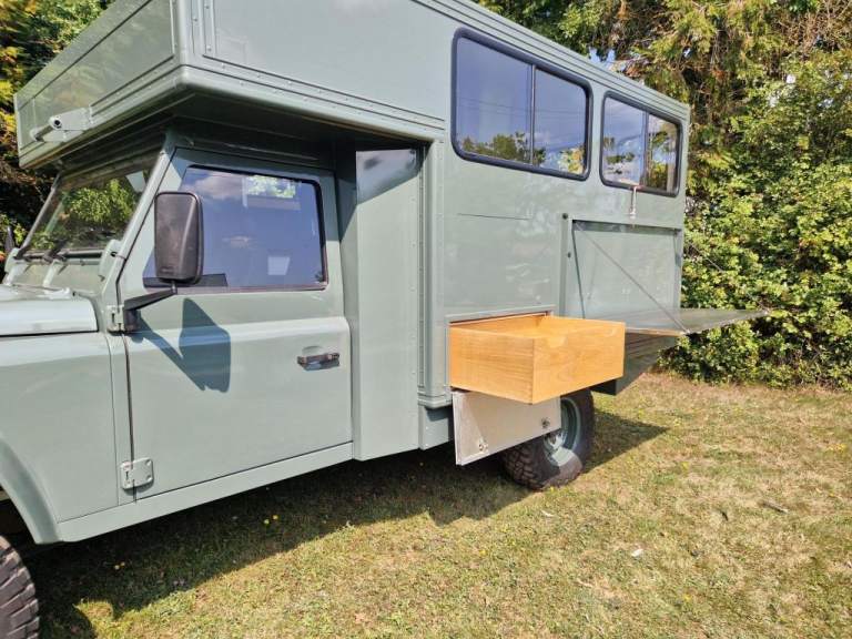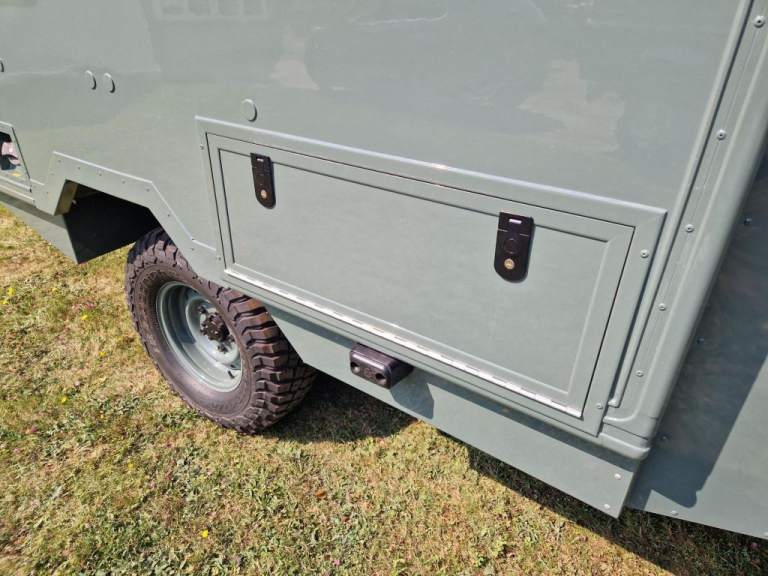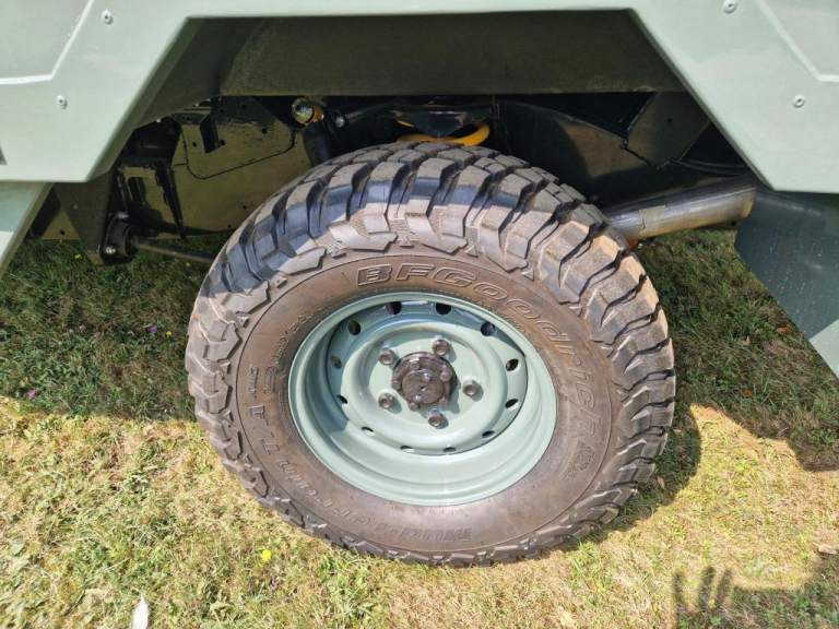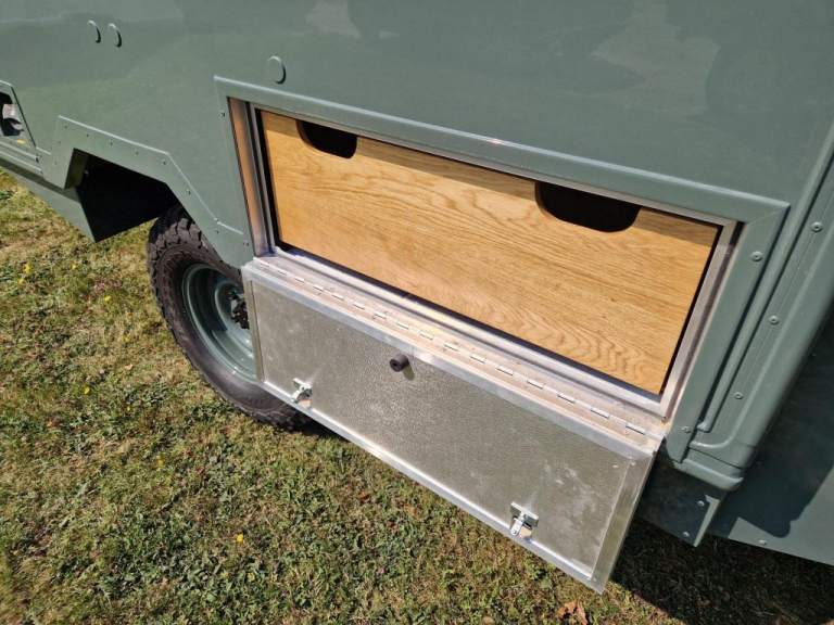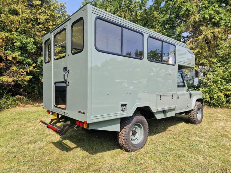 We have fully rebuilt this vehicle. Started off as a 130 chassis cab in silver and we have changed the chassis to a Marsland Galvanised chassis and this has been powder coated black. Replaced the bushes, OME Gas shocks, springs, brakes, clutch kit, brake lines and many other mechanical parts. The rear body is insulated and we have fitted the glass, rear door, rear double step and the complete vehicle was stripped and painted Keswick green and then put togther by hand. The rear seats are hinged for storage and there is a large shelf above the cab for gun storage. Seats are finished in the rear in green vinyl with French Oak trim as pictured. There are two drinks side lockers with pull ou