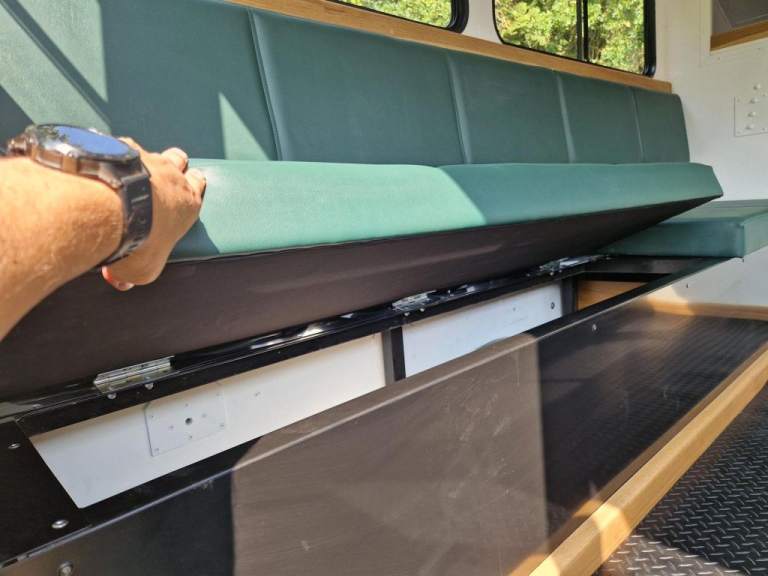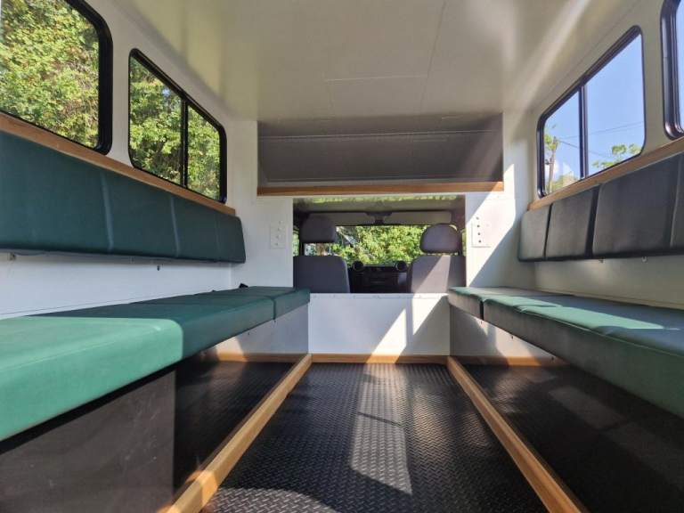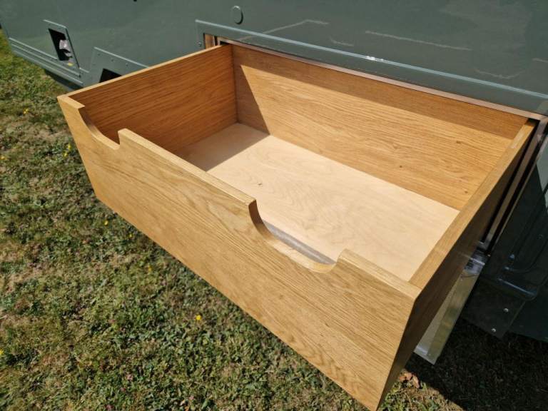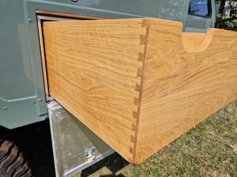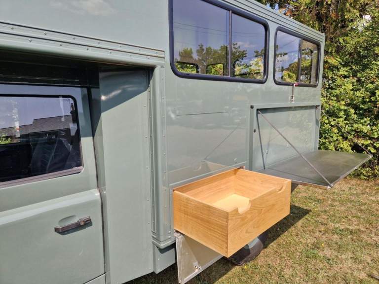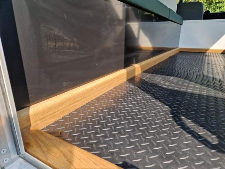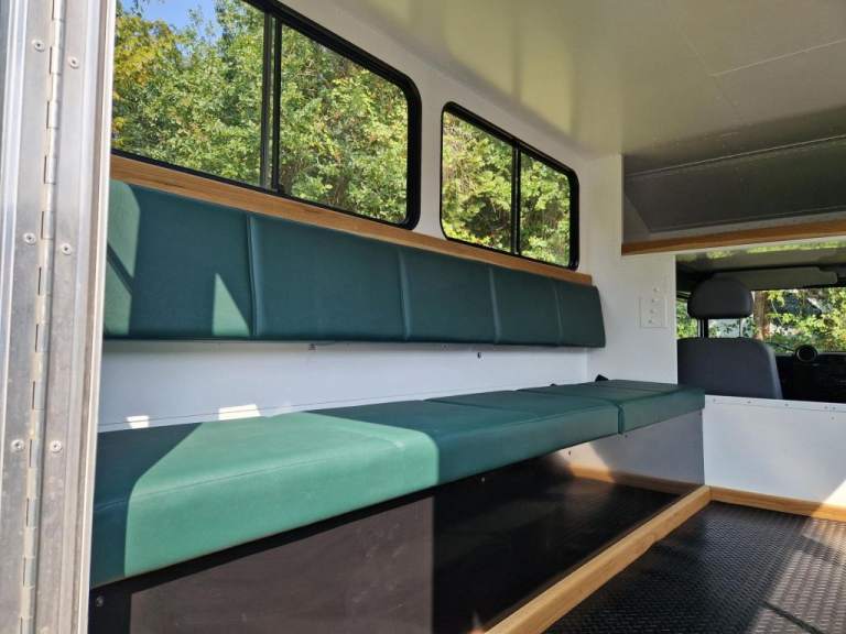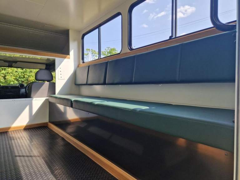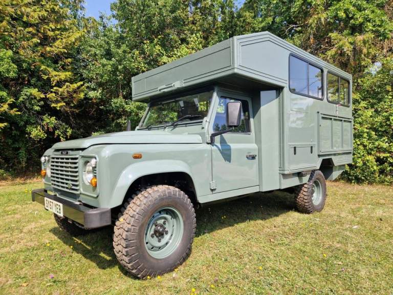 We have fully rebuilt this vehicle. Started off as a 130 chassis cab in silver and we have changed the chassis to a Marsland Galvanised chassis and this has been powder coated black. Replaced the bushes, OME Gas shocks, springs, brakes, clutch kit, brake lines and many other mechanical parts. The rear body is insulated and we have fitted the glass, rear door, rear double step and the complete vehicle was stripped and painted Keswick green and then put togther by hand. The rear seats are hinged for storage and there is a large shelf above the cab for gun storage. Seats are finished in the rear in green vinyl with French Oak trim as pictured. There are two drinks side lockers with pull ou