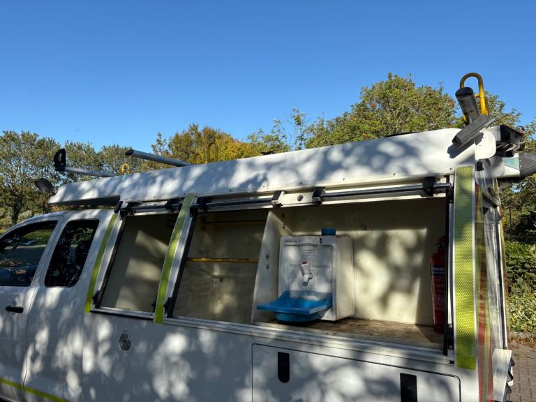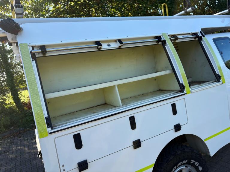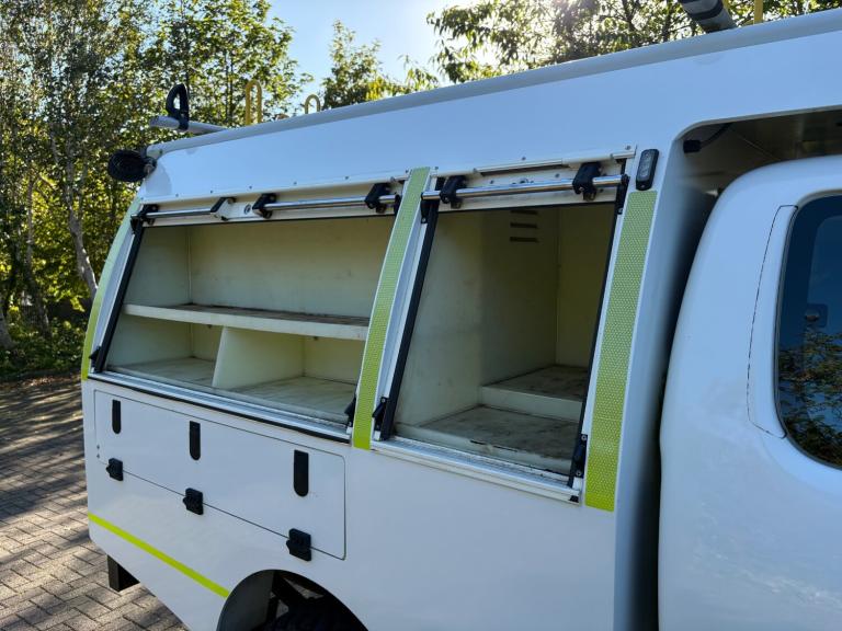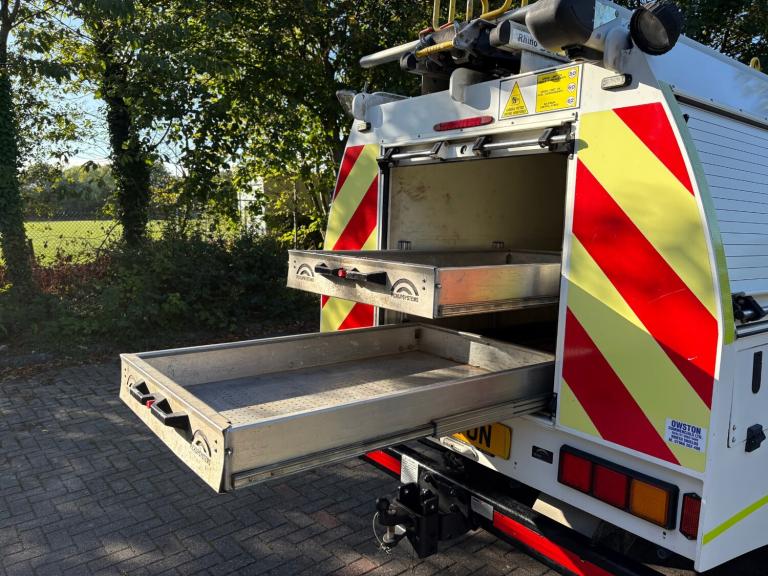 The bespoke workshop body to the rear consists of roller shutter doors which intern provides access to a vast amount of internal storage space, it has Two large sliding drawers to the rear and an Eberspaecher hand wash basin. Other extras also include a tilt and slide safe stow ladder rack and a Rhino van guard pipe carrier. It also comes with an Antares inverter and an Eberspaecher night heater with control thermostat. (please note - all ancillary items such as these are not tested nor warranted by ourselves)