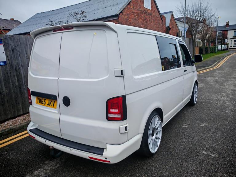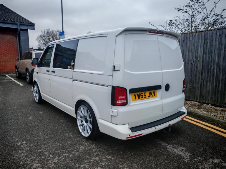 standard power. Timing belt has been renewed. New clutch slave cylinder., Rotiform DTM stagard fit Alloys with good tyres costing over £2000 load rated for Transporters. 3P Air management system. APB Air lift kit £4950. Notched chassis. Over £2000 to have installed. Air management under van, not in the rear creating more space. Powerflex bushes upfront. New drive shafts. Insulated and sound proofed rear. Dynamic front smoked lights. Dynamic side repeaters. Dynamic rear lamps. Lights from Transporter HQ. Black suede roof linings, The cabin is done in the same trim. Passat type R Heated 2 stage black leather seats up front £1000. 113k miles. Just serviced. Bed in rear. MOT December 2026.