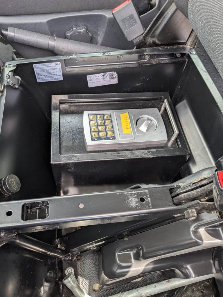 The van has 2 keys and has a safe bolted under the front passenger seat for storing valuables (see picture). There are 2 keys for the safe too, plus a keypad option. The bulkhead can be removed if required.