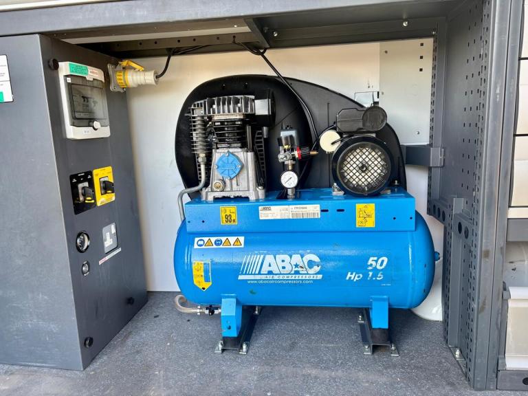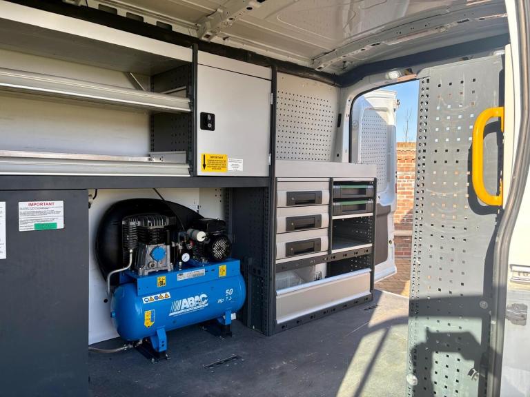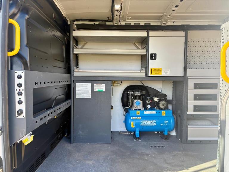 Then in the rear of this van it has had a small fortune spent on it converting it to a mobile fitters van with Bott racking and draw units down both sides, storage boxes, heavy duty fold out vice, heavy duty 110v & 240v power, 50ltr ABAC air compressor, extra LED internal lights, hot water hand wash, roof mounted fresh air roof vent, LED amber flashing lights, LED roof mounted work lights, you name it this van has it!!!