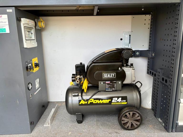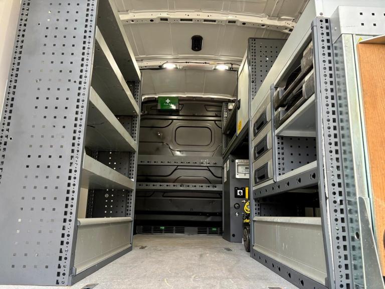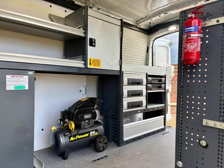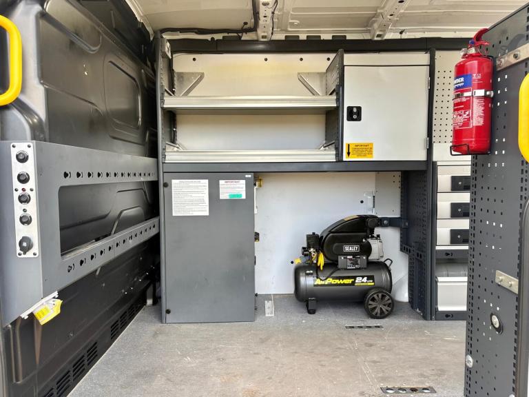 Then in the rear of this van it has had a small fortune spent on it converting it to a mobile fitters van with Bott racking and draw units down both sides, storage boxes, heavy duty fold out vice, heavy duty 110v & 240v power, air compressor, extra LED internal lights, hot water hand wash, roof mounted fresh air roof vent, LED amber flashing lights, LED roof mounted work lights, you name it this van has it!!!