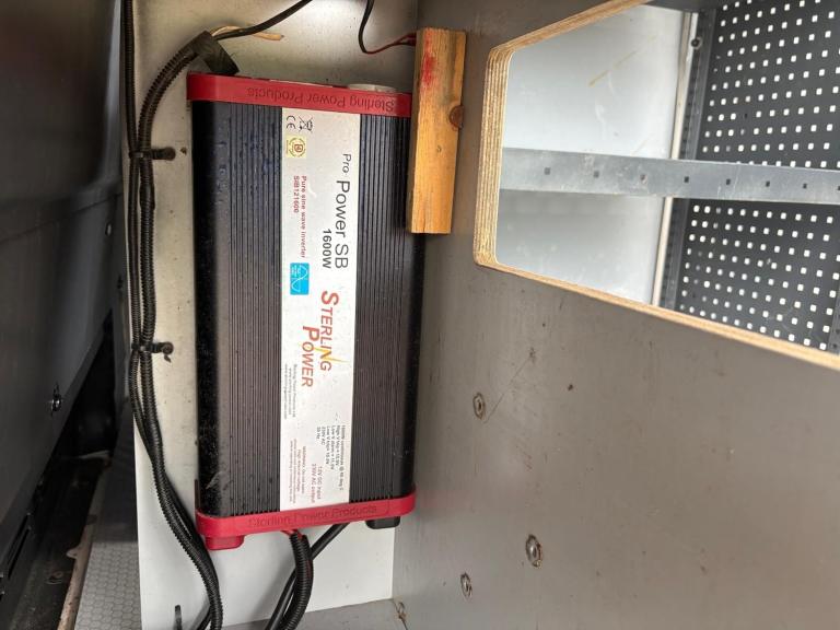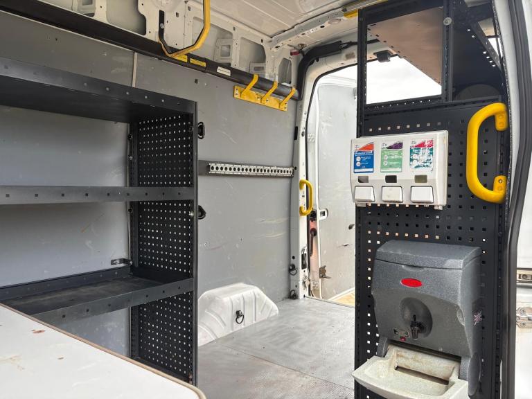 Then in the rear of the van it has had a small fortune spent on it been fully kitting out as a workshop van with Tevo racking down both sides, extra LED internal lights, LED work lights, hot water hand wash, soap dispenser, microwave, 240v power inverter, anti slip flooring, and best of all it has a PTO driven Gardner Denver Compressor / Generator producing 8 Bar /120 Psi of air and 110v of power.