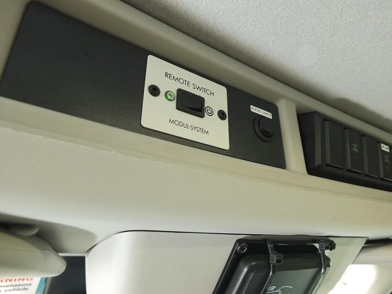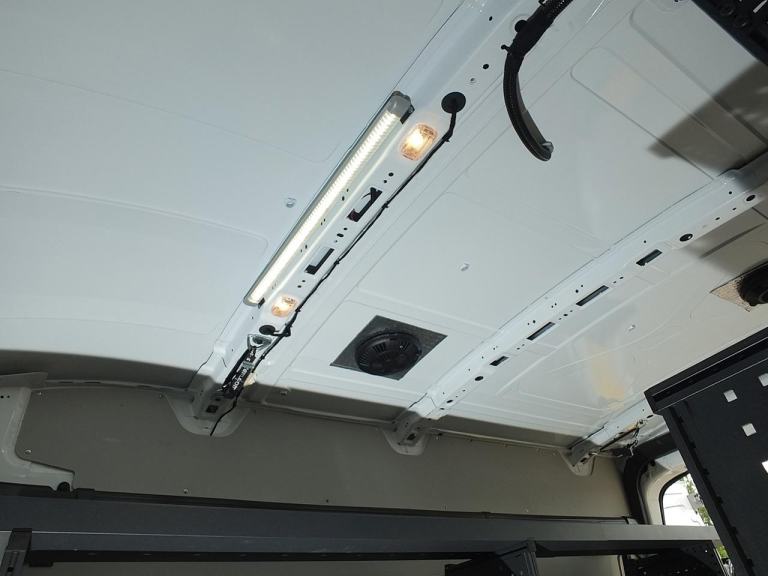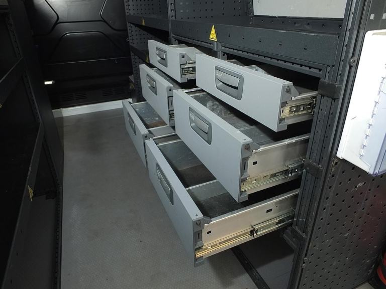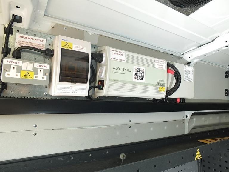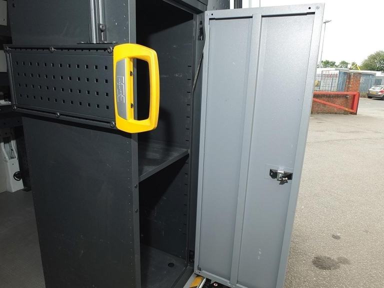 Mobile Workshop / Utility Van with Extensive 'Modul-System' Modular Van Racking System featuring: Shelving & Workbench, Storage Cupboard & Drawers, Engineer's Vice, 200W 12V DC to 240v AC Power Inverter with RCD Protected 6A 3-pin Mains Socket Outlets, Eberspächer Diesel-Powered Heater for Rear Compartment, Rhino Roof Bars with 'SafeStow4 Type G' Gas Strut-assisted Ladder Loading / Unloading Aid - Ideal Workshop or Service Van for a Mobile Mechanic, Maintenance Engineer, Plumber or Electrician, Utilities & Groundworks Sector