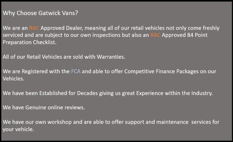 At RDC Gatwick Vans We Specialise in Vans From 2007 to 2020. All Of Our Vehicles Are Pre Checked By Our In House Mechanics. All Vans are HPI Checked. We Offer Part Exchange. Our Opening Times Are : Mon-Sat 8-4. Find us at RDC GATWICK VANS, Derrinabrin Farm, Norwood Hill Rd, RH60EB (10 Mins from Gatwick Airport) Credit Debit cards taken. Please Call on [Phone number removed] or Call free on 08001588061. Over 30 vans in stock