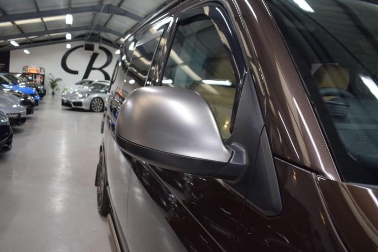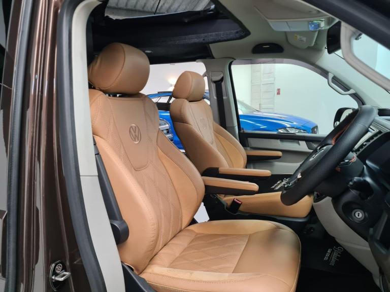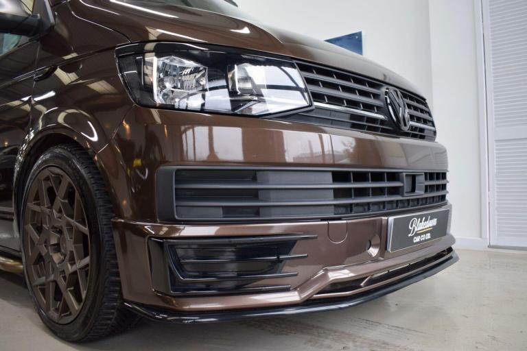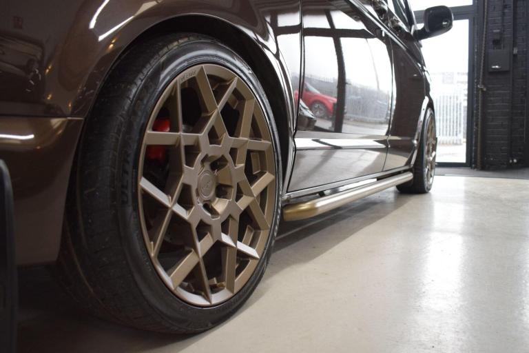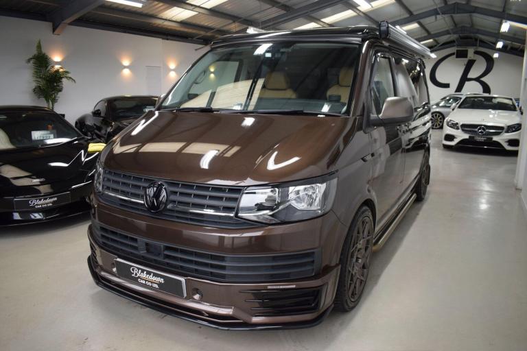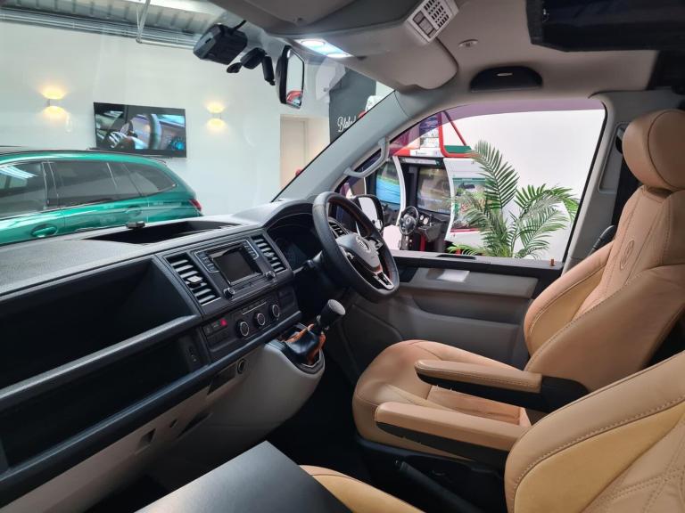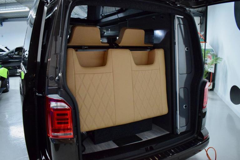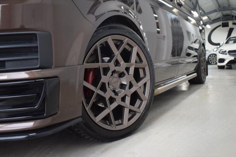 2019 ’19 Volkswagen Transporter Shuttle 2.0 TDI (175bhp) BlueMotion Tech S FWD SWB 4-berth, 5 seater camper conversion with twin sliding main side doors (rare). Finished in beautiful and rare VW Chestnut Brown Metallic with a full custom Sunburst Tan leather interior. Just 42450 miles covered with service history to support, the latest of which has been completed in house ready for the next owner. Supplied with all correct documentation, handbooks etc and has been subjected to our usual strict pre delivery inspection and preparation process ensuring all cosmetic and mechanical elements are in good order. This camper is boasting one of the most complete and impressive specification and equipment lists we have seen to date. In terms of performance/mechanical upgrades, the van benefits from: ACE Remaps ECU calibration to produce 175bhp with supporting invoice, load rated adjustable coilovers, 20” Velare alloys finished in Sepang Bronze and upgraded Brembo brake discs and pads. For the full, comprehensive list of upgrades, equipment and features please see second image.