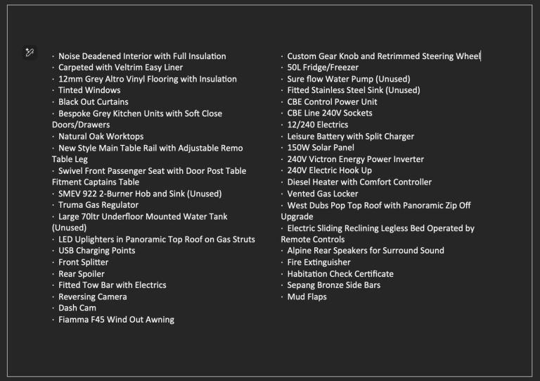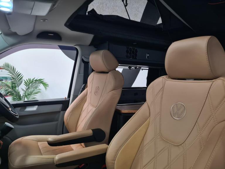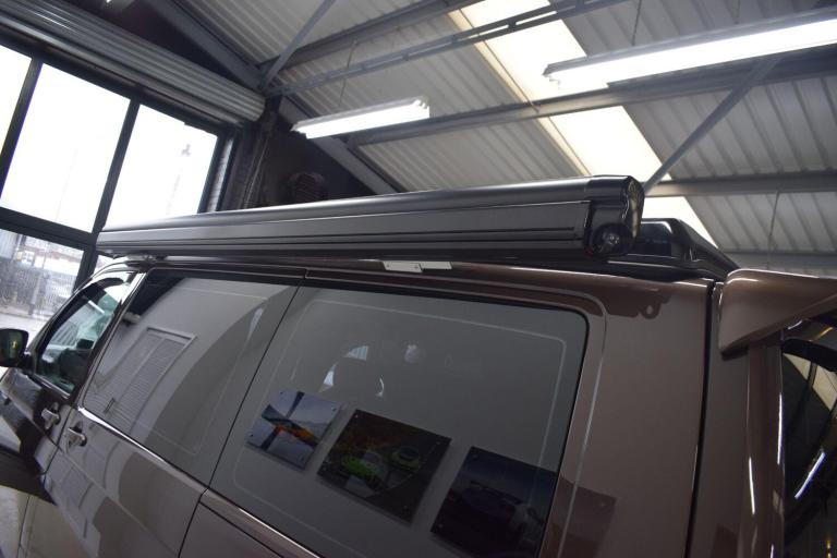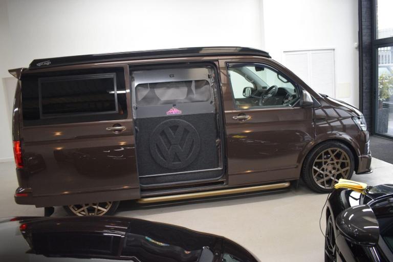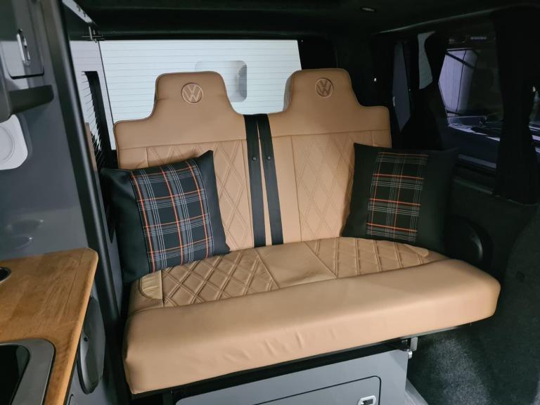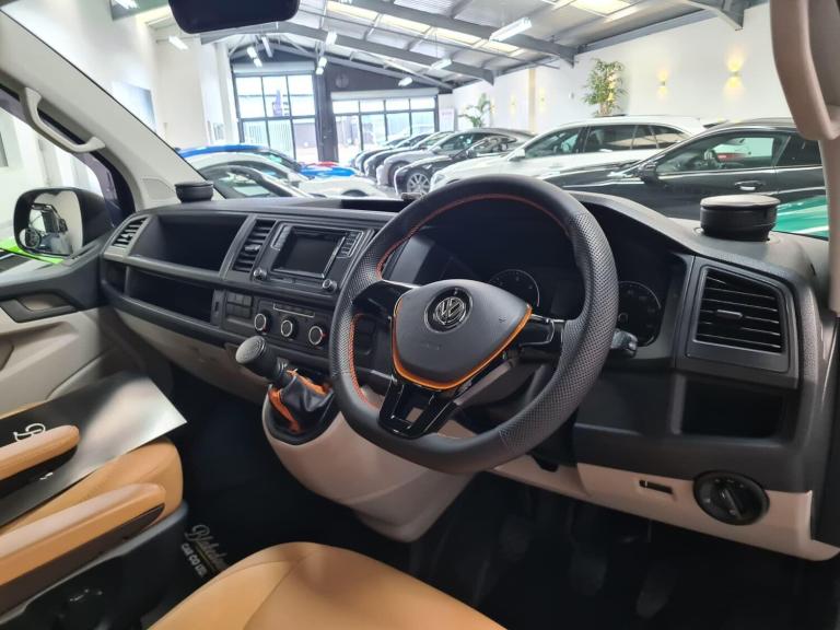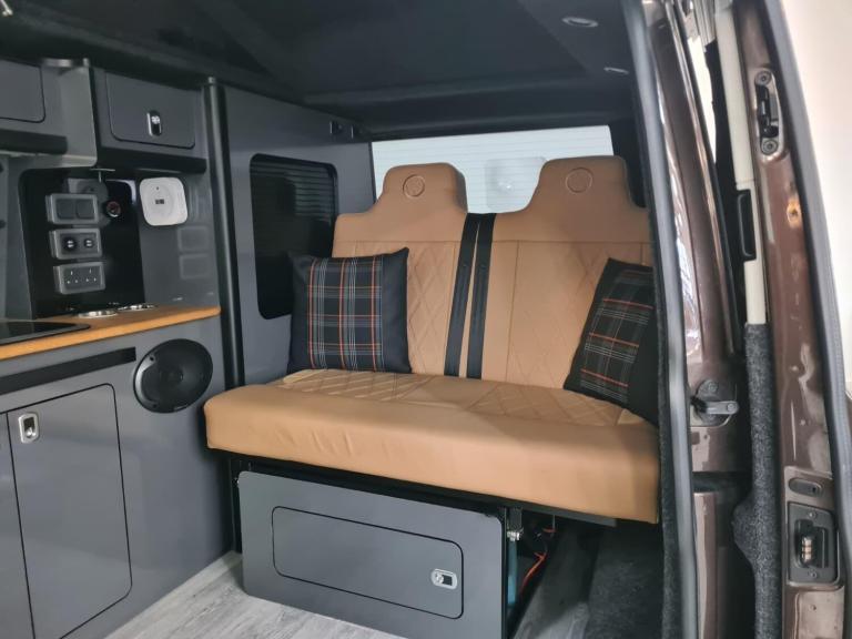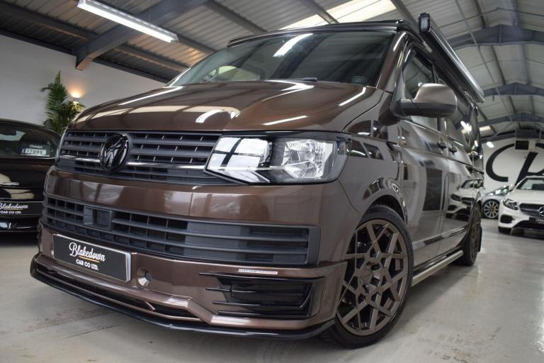 2019 ’19 Volkswagen Transporter Shuttle 2.0 TDI (175bhp) BlueMotion Tech S FWD SWB 4-berth, 5 seater camper conversion with twin sliding main side doors (rare). Finished in beautiful and rare VW Chestnut Brown Metallic with a full custom Sunburst Tan leather interior. Just 42450 miles covered with service history to support, the latest of which has been completed in house ready for the next owner. Supplied with all correct documentation, handbooks etc and has been subjected to our usual strict pre delivery inspection and preparation process ensuring all cosmetic and mechanical elements are in good order. This camper is boasting one of the most complete and impressive specification and equipment lists we have seen to date. In terms of performance/mechanical upgrades, the van benefits from: ACE Remaps ECU calibration to produce 175bhp with supporting invoice, load rated adjustable coilovers, 20” Velare alloys finished in Sepang Bronze and upgraded Brembo brake discs and pads. For the full, comprehensive list of upgrades, equipment and features please see second image.