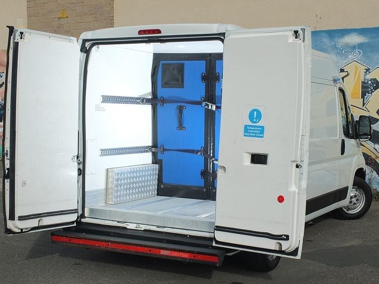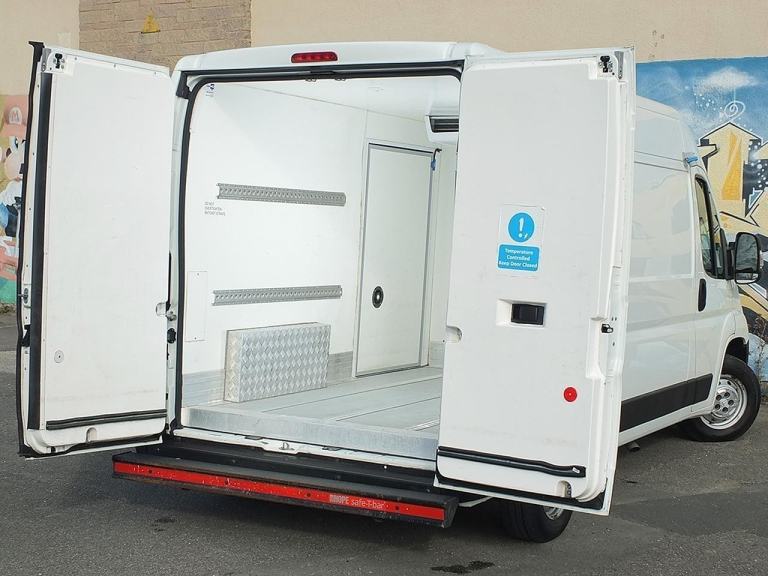 Front Load Compartment Accessed via Large Slab Door on Near-Side, Rear Chiller Compartment Accessed via Twin Rear Doors - Can Also be Used for Ambient Delivery, 75mm Side & Roof Body Insulation, 63mm Rear Door Insulation, 82mm Thick Insulated Slab Door, LED Interior Lamps, Stainless Steel Load-Lok Load Restraint Rails, Internal Emergency Door Release, Telematics Box for 'Free2Move Connect' Fleet Services, Fold-Away Clipboard on Dash, 3 Seats - Double Passenger Seat with Fold-Down Document Tray, L2 Medium Wheelbase 3.5 tonne GVW Van with H2 Medium Roof, High Specification 'Enterprise' Model (Equivalent to Boxer "Professional" & Movano "Prime"),
