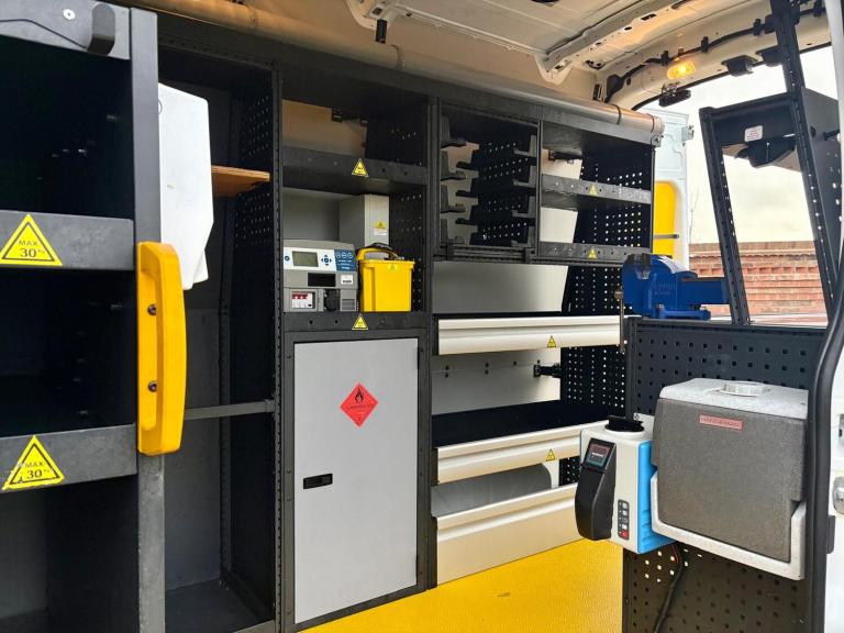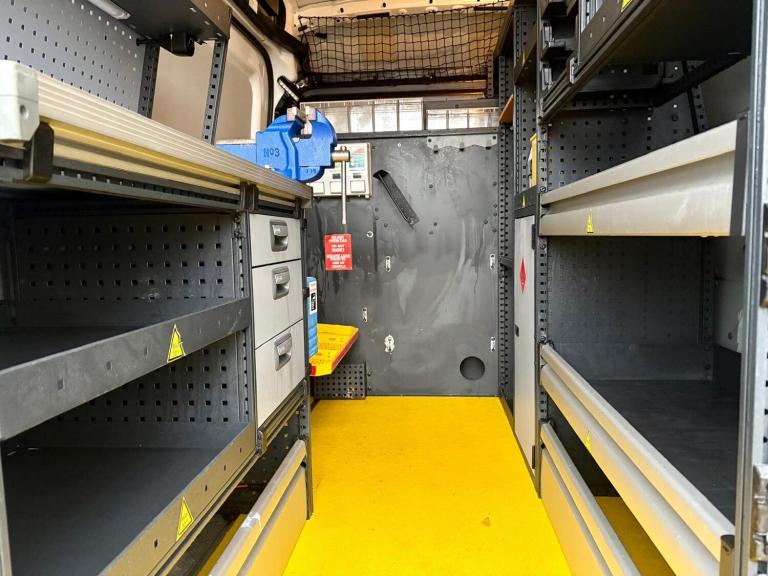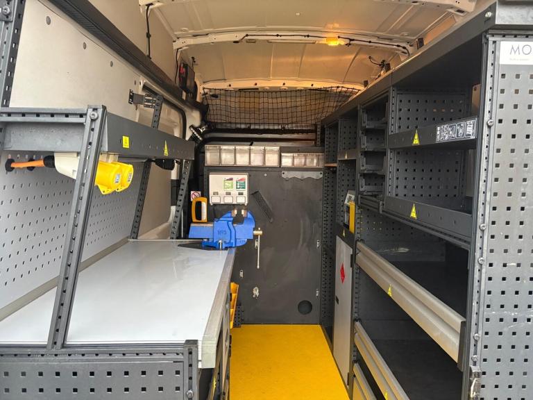 Then in the rear of this van it has had a small fortune spent on it converting it to a mobile fitters van with Modul System racking and draw units down both sides, work bench, vice, heavy duty 240v power inverter, 110v power, split charge system, extra LED internal lights, LED work lights, roof mounted fresh air roof vent, LED amber flashing lights, night heater, hot water hand wash, water boiler etc.