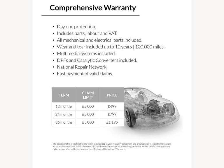 All Herts Prestige cars are offered with a HPI clear certificate. We also include a 3 month Basic Driveline Warranty or You can upgrade to a Premium Warranty which covers all Electrical + Mechanical Components @ Any VAT registered Garage in the UK From only £299 for 12 Months , £450 for 24 months, £ 600 for 36 Months, 4WD Vehicles and Higher Performance cars may be loaded please ask for a quote.These Optional Warranties have Fantastic Coverage of Many Components, Please ask for details.