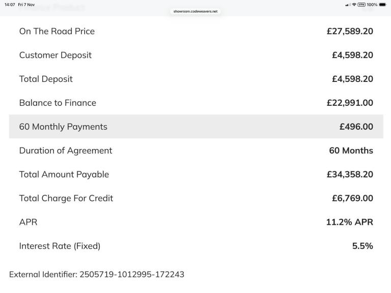 MONTHLY PAYMENT £496 x 60 AT 11.2 % APR Full breakdown of this quote in pictures.