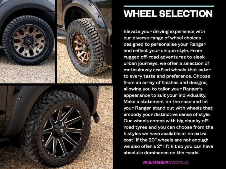 WELCOME TO RANGER WORLD, WE HAVE THE LARGEST STOCK OF PRE BUILT & BESPOKE BUILD RANGERS IN THE UK PART EXCHANGE & FINANCE AVAILABLE (REPRESENTATIVE 9.9% APR) WE ARE A CREDIT BROKER NOT A LENDER TO VIEW PLEASE CALL AS WE ARE STRICTLY BY APPOINTMENT ONLY. THIS ENABLES US TO GIVE YOU OUR UNDIVIDED ATTENTION. OUR STOCK CHANGES DAILY SO PLEASE CONFIRM WITH US THIS VEHICLE IS STILL AVAILABLE. ALL WRAPS AND SPORTBACK CANOPY IN THE PHOTOS ARE EXTRA-COST OPTIONS INCLUDED IN THE PRICE IS THE FOLLOWING SPEC. 1: 20" Upgrade wheels and tyres… 4 STYLES AVAILABLE 2: CENTURIAN edition Wide Bodykit. 3: RW Front Grill. 4: Front Bonnet Apron 5: Bonnet Scoop. 6: Roof light bar. 7: Bonnet Scoop. 8: Front City Bar. 9: black brake calipers. OPTIONAL AT EXTRA COST SPORT BACK HYDRAULIC COVERS £2500. BODYWRAP FROM £2500 REAR CANOPIES £3000 At Ranger World, we take pride in offering a unique and personalised experience for enthusiasts of the iconic Ford Ranger and Mustangs. Specialising in these Icons means we go beyond the ordinary to deliver vehicles that reflect your style and preferences. Our vehicles are hand-built by our skilled team in Northamptonshire. Here at RANGER WORLD, we are a small passionate team dedicated to making purchasing your new car the best experience you will ever have! No sales staff just enthusiasts. Our unique and stunning showroom is nestled in 150 acres of beautiful Northamptonshire countryside. 1 mile from J12 of the A14…. WANTED PLATINUM DERANGED RAPTER F150 KAHN REVERE GVE URBAN CINCH OVERFINCH VVS SEEKER DIRTY UNICORN AUTOLAB GC SHELBY RAPTOR FAIR PRICES PAID FOR THE RIGHT EXAMPLES! RANGER WORLD exercises all reasonable care and skill in providing you with spec check Data. All rights reserved. RANGER WORLD does not accept responsibility for errors, omissions, liability or loss suffered due to the use of spec check Data by any user or other party. spec check is a guide and all equipment should be physically verified, RANGER WORLD does not warrant any information provided as part of the spec check..