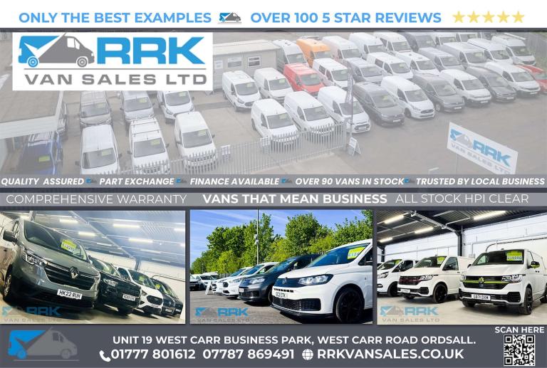RRK Van Sales Ltd is a family owned & run business which has been trading for over 14 years, our aim is to provide the very best vehicles at the very best prices. Not only do we pride ourselves on quality of our vehicles, but also on the quality of customer service we provide, giving you the best possible experience when you come to visit us. All our vehicles are hand selected and go through a pre-delivery inspection to ensure the vehicle is road worthy and exceeds our very high standards before leaving our showroom. All vehicles are guaranteed HPI checked to ensure the vehicle has not been, written off, scrapped, exported or imported, stolen or used for security against a finance agreement. We also check the National Mileage Register to ensure the vehicle has genuine mileage. All our vehicle are supplied with comprehensive warranty (unless stated) giving you the peace of mind you need when driving away. To hear about all our stock, please don't hesitate in giving us a call