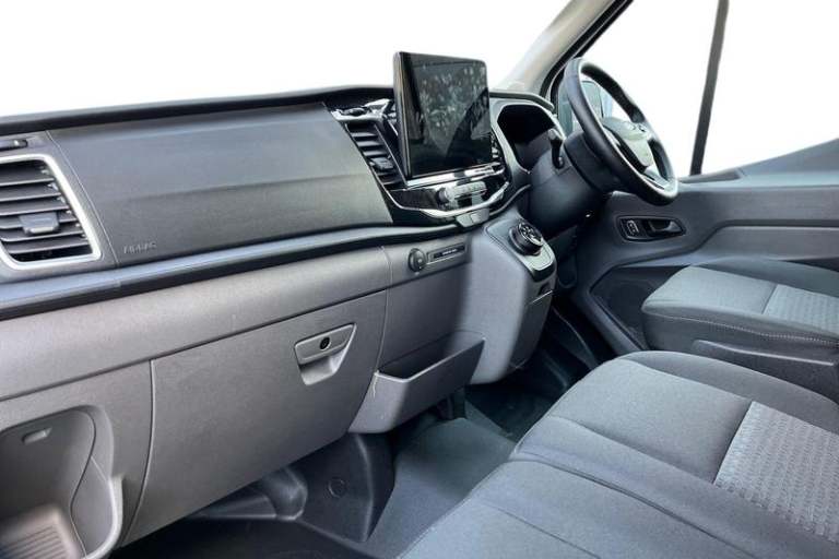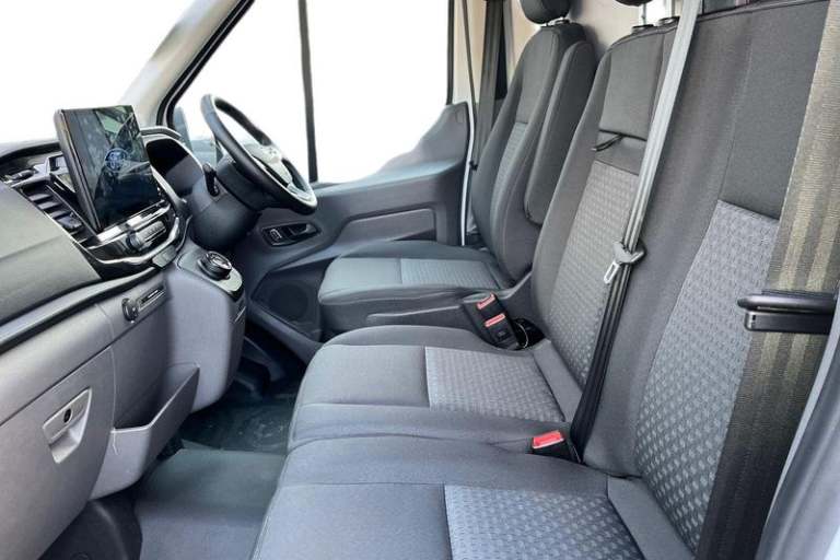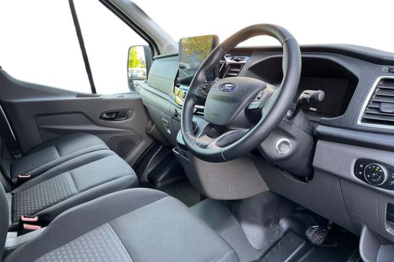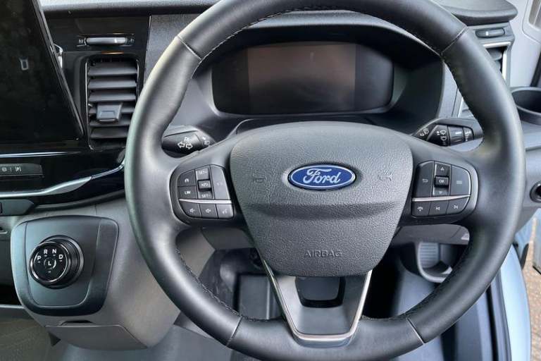 REAR VIEW CAMERA shows whats behind you on a screen in front of you on the dashboard - the system activates when you select reverse gear and using virtual guidelines can help you park, CRUISE CONTROL provides extra comfort on longer journeys allowing you take your foot off the acceleration whilst just focusing on steering the vehicle, FORDPASS CONNECT MODEM - Ford Pass App allows you to unlock a range of smart features including Remote Locking - Vehicle Location and more, PAS, Rear bumper with integral step, Single rear wheels, Rear mudflaps, Driver's armrest, Warning lights, Electronic parking brake, Reach and rake adjustable steering column, High mounted stop lamp, Audio controls mounted on steering wheel, 2 x 12V power outlets, Heavy duty front axle, Wide bodyside mouldings, Dual passenger seat tray and table, Easy clean load floor, Side wind mitigation, Lockable glove box, Navigation system, Power windows, ABS + ESP + Hill start assist, Emergency brake warning, Radio with remote stalks, Kerbside side load doors, Molded load floor liner, Rear splash guards, Seatbelt reminder on front seats and fixed rear seats, Ful wheel covers, Speed limiter, leather steering wheel and trip computer, Medium roof line, LONG WHEEL BASE, ULEZ COMPLIANT, CAMERA