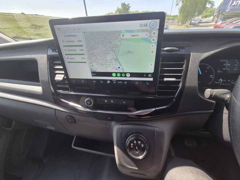 .,.12'' Touchscreen with SYNC4 navigation, 5G Modem, 8'' Part digital instrument cluster, Emergency assistance, Emergency brake warning, Intelligent Speed Assist, Lane centering assist, PAS, Selectable drive mode, Trip computer, Warning lights, 4 radio speakers, Audio controls mounted on steering wheel, DAB Radio, Auto high headlamp, Automatic windshield wiper, Daytime running lights, Driver large head/short arm mirror, Driver one touch up/down power windows, E-Transit badge, Electric windshield defroster, High mounted stop lamp, Part body colour front bumper, Plastic rear bumper, Quad beam headlamps, Quickclear heated windscreen, Wide bodyside grey mouldings, Automatic air conditioner with 12 inch multi function display, Header courtesy lights, Heated steering wheel, Load compartment light, Load compartment tie down loops, Molded gear shift knob, Overhead console, Partial molded headliner, Partial rubber inside floor cover, Radio with remote stalks, Reach and rake adjustable steering column, Driver and passenger seatbelt reminder, Driver front seatbelt buckle pretensioner, Front passenger airbag deactivation, Tyre pressure sensors, Wireless beltminders, Door entry remote control unit 2 Fobs key, Speed dependent power lock group, 2 x 12V power outlets, ABS + ESP + Hill start assist, Delete starter equipment, Deleted engine governor, Electric parking brake, Rear axle Alt A - Narrow track, Side wind mitigation, Unique Grille with Charge Port, 16'' Steel road wheels x 6.5, Single rear wheels