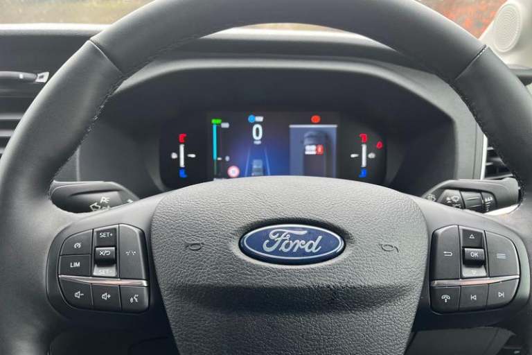 DIGITAL REAR VIEW MIRROR is an intelligent rear vision system that uses a rearward facing digital camera to capture video and stream it to the mirror-integrated LCD display, QUICKCLEAR HEATED WINDSCREEN uses ultra thin filaments that superheat to de-ice and de-mist your windscreen as well as help de-freeze the wipers and works in seconds, CRUISE CONTROL provides extra comfort on longer journeys allowing you take your foot off the acceleration whilst just focusing on steering the vehicle, FRONT AND REAR PARKING SENSORS are designed to help you park more confidently helping you judge the distance between your vehicle and obstacles both in front and behind you, BLUETOOTH HANDS FREE WITH VOICE CONTROL allows you to operate both your mobile phone and Ford audio system - controlling several functions using a set list of simple voice commands, Automatic air conditioner with 12 inch multi function display, Self coloured lower front bumper, Lane centering assist, Single rear wheels, Quickclear heated windscreen, Automatic windshield wiper, Rear mudflaps, Warning lights, Reach and rake adjustable steering column, High mounted stop lamp, Front passenger airbag deactivation, Auto high headlamp, Audio controls mounted on steering wheel, 2 x 12V power outlets, Configurable Unlocking, Roof mounted radio antenna, Header mounted courtesy lights - 2 map lights, PAS, Water in fuel filter with sensor, Shielded power door deadlocks, Self coloured front grille with chrome surround and Anodised blue