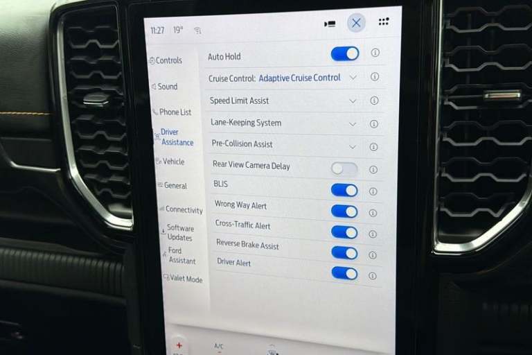 FRONT AND REAR PARKING SENSORS are designed to help you park more confidently helping you judge the distance between your vehicle and obstacles both in front and behind you, REAR VIEW CAMERA shows whats behind you on a screen in front of you on the dashboard - the system activates when you select reverse gear and using virtual guidelines can help you park, ADAPTIVE CRUISE CONTROL allows you to choose the speed you want to drive at and the system will maintain it - if the sensor detects a vehicle ahead it will slow the vehicle down to maintain a preset distance, HEATED FRONT SEATS Provide comfort in any weather, Dual power heated fold back door mirror with puddle lamps, Electronic dual zone automatic air conditioning, Immobiliser, Roof rails, Engine start/stop system, Ladder rack, Privacy glass, Trip computer, Reach and rake adjustable steering column, Child proof rear door locks, 12V aux rear power point plug, Pollen filter, High mounted stop lamp, Body coloured door handles, Tie down rails and rope hooks, Automatic headlights, Power door dead locks, Rear seat pack 15 - Ranger, Electrochromic interior mirror, Daytime running lights, Heated steering wheel, Premium front and rear floor mats, ABS/ESP brakes with electronic brake boost, Pre collision assist, Passenger side roof mounted grab handle, ISOFIX child safety seat attachment, Acoustic laminated windscreen, Under hood engine cover, Locking wheel lug nut, Active grille shutter, Tyre pressure sensors, Accent colour exterior
