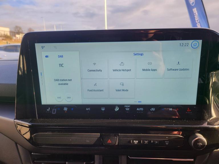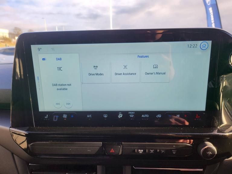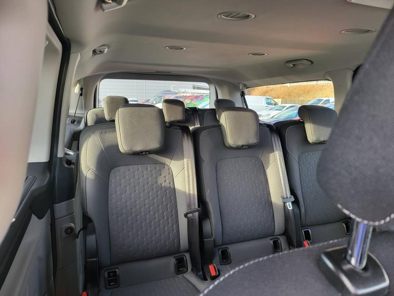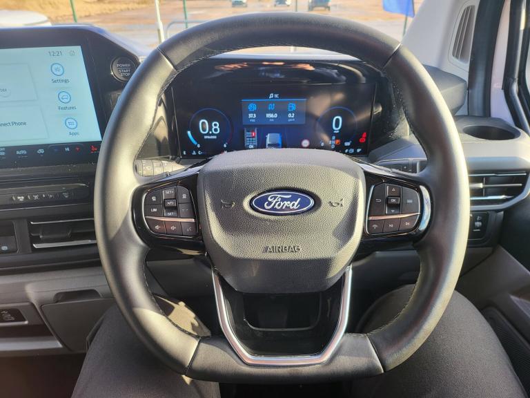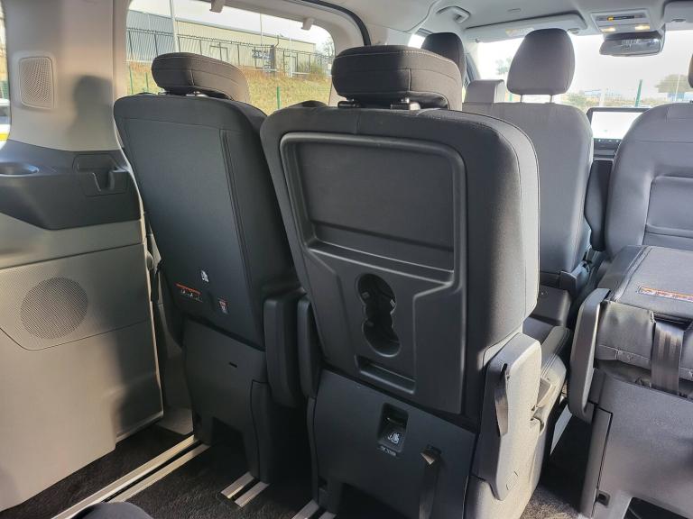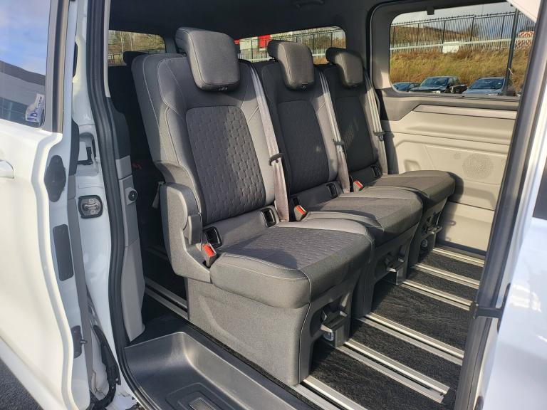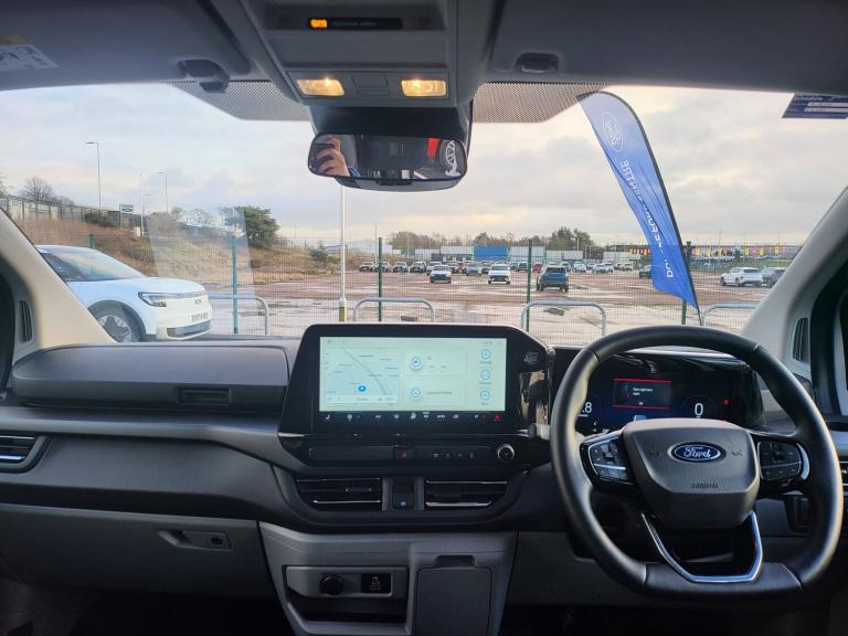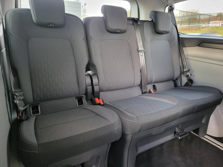 3 point seatbelts for all seats, Black seat belt, Driver and passenger seatbelt reminder, Driver's airbag, Front seatbelt pretensioners, Passenger airbag with deactivation switch, 13 inch Touchscreen, 5G embedded modem, PAS, Rear USB 3 port for charging, Trip computer, Tyre pressure monitor, Voice control system, 3rd Row left and right fixed windows, Automatic windscreen wipers, Body colour front bumper, Body colour rear bumpers, Body coloured exterior mirrors, Day-and-night rear view mirror, Daytime running lights, Dual side load doors, Fixed 2nd row windows, Fixed LED headlamps with auto high headlamp, Fixed rear window, Front splash guard, Heated door mirrors, Low roof line, Medium duty towing, Power front windows with one shot up/down, Privacy glass, Quick clear front windshield defroster, Rear cargo liftgate door, Rear splash guard, Rear washer/wiper, Rear window defroster, Solid paint, Sun blinds, 4 Load compartment tie down loops, Automatic air conditioning, Coat hook, Comfort seat, Driver and passenger storage bins on facia with lids, Facia mounted tray with pen holder and cupholders, Front door map pockets, Full moulded headlining, Header courtesy lights, Height adjustable head restraints, Illuminated footwell, Interior grab handles with driver's sunglasses holder, Isofix child seat attachments - centre and offside 2nd row seats, Leather gearknob, LED load compartment lighting, Lockable glove box lid, Map reading lights, Passenger sunvisor, Passengers side open storage, Rear armrest, Rear reading light, Rear seat climate control, Reclining rear seats, Small floor mounted console, Small overhead console, Tool kit, Twin bottle holders, Dark complete single passenger seat pack - Tourneo custom, Navigation plus pack - Tourneo custom auto, Rear seat pack - Tourneo custom, 2 remote keys, Alcohol interlock preparation, Keyless entry and start, Locking configuration 2, Locking wheel lug nut, Non-swivel driver seat, Non-swivel passenger seat, Remote central locking, Speed dependant locking, Stolen vehicle recovery system, Thatcham category 1 alarm with power door deadlocks, Two step door unlock system, 20L AdBlue tank, 55L Standard diesel, ABS, Alternator - 150A, Battery saver, Diesel particulate filter, ESP, H7 Single AGM battery, Power socket in drivers stowage bin, Rear auxilliary power point socket, Rear power point plug, Roll stability control, Side wind mitigation, 10 speakers, Audio controls mounted on steering wheel, SYNC 4 - Android Auto/Apple