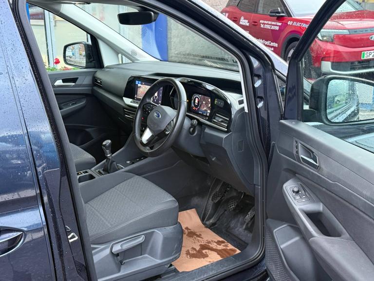 Curtain airbags, Driver and front passenger airbag, Driver and passenger seatbelt reminder, Front active seat belts, Front passenger airbag deactivation, Front seat belt adjuster, 10 inch touchscreen infotainment display with volume and temperature slider controls, Android Auto and Apple Carplay with USB or wireless connectivity, Brake wear indicator, Enhanced digital cluster with navigation integration, Fordpass connect modem including eCall, Front camera system, PAS, Tyre pressure monitoring system with cluster display of tyre pressures, Wireless charging pad, Auto Headlamps - Follow Me Home, Automatic headlamps on/off, Automatic windshield wiper, Black painted exterior mirror caps, Body colour door handles with silver door rail, Body coloured exterior tailgate handle, Body coloured front bumper, Body coloured rear bumper, Chrome grille and fog light surrounds, Day and night inside mirror, Daytime running lights, Dual power heated mirrors, Dual side load doors, Emergency brake light flashing, Front fog lights, Halogen headlamps, High mounted stop lamp, Hinged and unglazed rear cargo door, Less roof rails, Misfuel Inhibitor, Power folding door mirrors, Power front windows - One touch up-down, Quickclear electric windshield defroster, Rear lights, Rear tinted glass, Solid paint, Standard green class windscreen, Tail lamps, Weather protection seals, 12V socket in cabin, 2 way front headrestraints, 4 way manually adjustable driver seat, 4 way manually adjustable passenger seat, Cargo area dual LED lights, Cargo area hardboard trim, Centre console with open stowage, Chrome air register, Driver and passenger sunvisor with mirror, Driver seat rotary recliner, Driver's seat lumbar support, Electronic dual zone automatic air conditioning, Fabric upholstery, First row LED light with map lights, Fold flat passenger seat with integrated work surface, Foot pedal, Full plastic bulkhead, Overhead storage compartment, Pollen filter without carbon filter, Reach and rake adjustable steering column, Rubber cab floor cover, Rubber load floor cover, Sensico gear shift knob, Sensico steering wheel, Silver interior door handles, DAT pack 3 - Transit Connect, Towing pre pack - Transit connect, Gloss black cluster and infotainment bezels with silver painted instrument panel spear, 2 remote keys, Ford KeyFree system with power starter button and deadlocking, Immobiliser, Locking wheel bolts, Thatcham alarm system, 12v socket on cargo area, 50L fuel tank, ABS, Electric parking