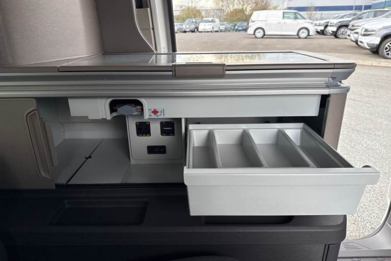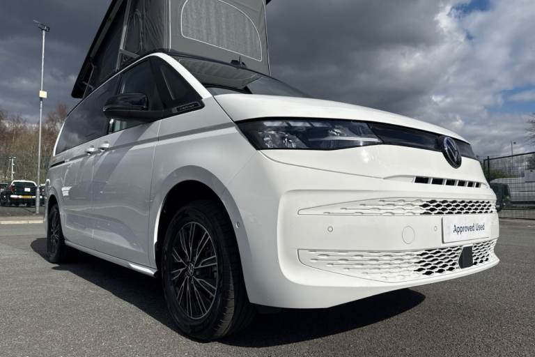 This Volkswagen California Coast T7 is finished in Candy White and offers an ideal balance of everyday usability and adventure ready versatility. It is powered by a 2.0 litre diesel engine paired with a smooth DSG automatic transmission, delivering relaxed and efficient driving on both short trips and longer journeys. Practical features include intermittent windscreen wipers, power adjustable, power folding and heated mirrors, and automatic headlights, all helping to maintain clear visibility in changing conditions. Front and rear parking sensors, together with a rear view camera, make manoeuvring and parking straightforward. A highlight is the electro hydraulic pop up roof, which creates comfortable sleeping accommodation for up to four people thanks to a roof bed and rear seat bed extension. Inside, the well designed kitchenette includes a gas hob, sink, and cool box, all accessible from inside or outside the vehicle for added convenience. An integrated awning provides welcome shelter, while the folding camping table and two chairs create a practical area for dining, working, or relaxing outdoors. Comfort is a priority throughout, with programmable parking heating, three zone Climatronic air conditioning, and an intuitive camper control panel that allows easy management of the roof, heating, climate, and ambient lighting. Both the driver and front passenger benefit from heated seats and supportive armrests. Behind the wheel, the leather wrapped multifunction steering wh...