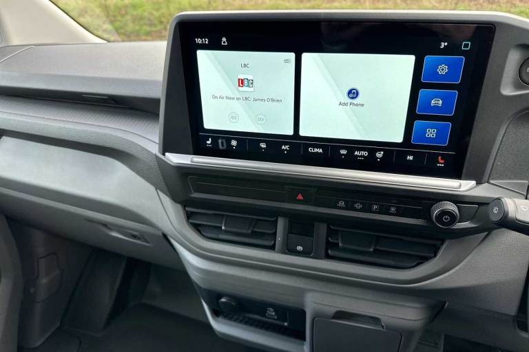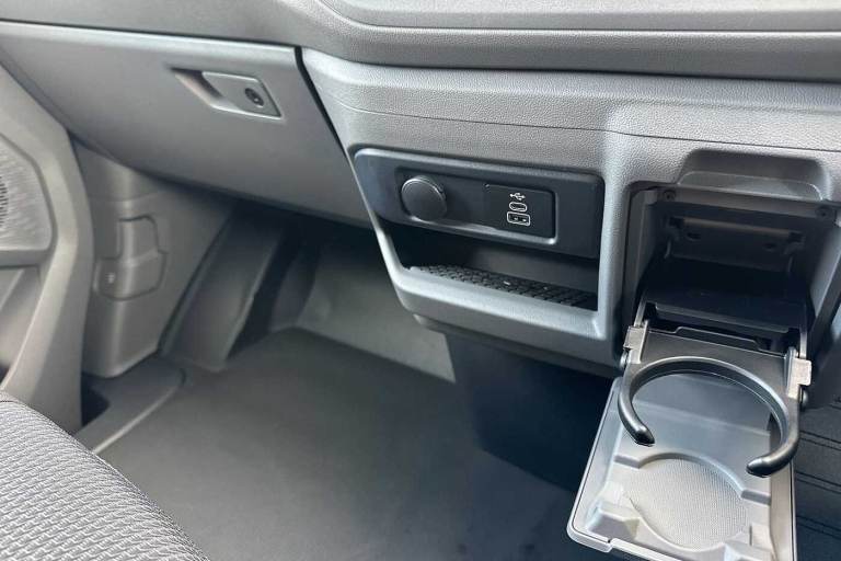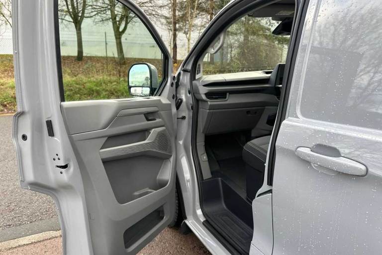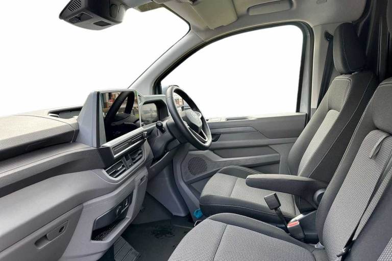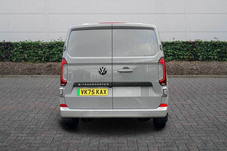 Available from 28/01/2026. Volkswagen Transporter T34 LWB Electric 100kW 65kWh Commerce Pro Van Auto in Stone Grey. Specification Includes Exterior Features,Steel underbody cladding for engine and transmission,Security,Keyless access with safelock,Paint - Solid,Solid - Stone Grey,Wheels - Alloys,16in Montreal grey metallic alloy wheels,Exterior Features,Heat reflecting side window glass,Body colour bumpers,Body coloured door handles,Body coloured radiator grille,Mud flaps front and rear,Rear Transporter nameplate in black grained decorative trim,Vehicle opening configuration 1x 1st row of seats- 2x all doors,LED rear lights with exclusive light signature,Safety,Electromechanical brake booster,Electronic stability control- ABS- ASR with deactivation button- hill start assist and brake assist system,Adaptive cruise control,Electromechanical speed sensitive power steering- height and longitudinally adjustable steering column,Lane and blind spot assist with exit warning system,Traffic jam assist,Wrong way driver warning,Body coloured door mirrors,Electrically heated- adjustable and folding door mirrors,Driver and front passenger airbag with front passenger airbag deactivation,Front and curtain airbags for driver and front passenger,Seat belt pretensioner for driver seat,Single tone horn,Audio / Communications,Apple CarPlay and Android Auto,Wireless mobile phone charging,Miscellaneous,12in digital drivers display,13in touchscreen infotainment display with wireless app connect and DAB radio,5G Modem,Dynamic road sign display,eCall emergency system,Preparation of VW connect and connect plus,Electrical,Without alternator,Interior Features,Electric auxiliary heater,Heat pump,2x 15-W USB data/charging ports in dashboard and 1x USB-C- 1x USB-A center bottom,3 spoke heated leather wrapped multi function steering wheel,5 additional USB-C charging ports,Black plastic scuff plate for sliding door in cargo without illumination,Glasses compartment in driver side roof,Grab handle on A-pillar passenger side,Illuminated lockable glovebox,Narrow centre console with cup holder and compartment for mobile phone,Overhead storage compartment,Rubber floor covering in cab,Striped fabric upholstery,Cabin interior lighting,Load Area,12V outlet in centre console and 12V outlet on rear right D-pillar,2x LED lights in load compartment,3x additional super bright LED lights in load compartment,Lashing rings for reinforced floor covering,Without passenger seats in load compartment,Trim,4