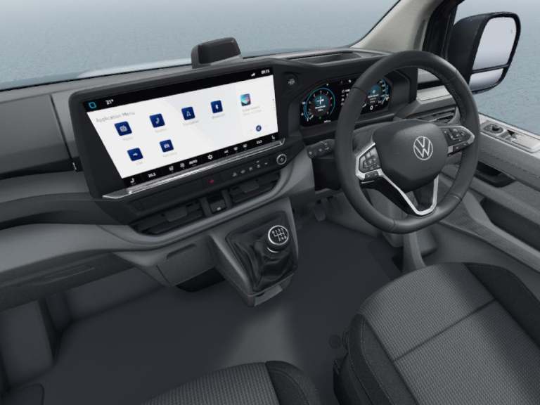 ..12'' digital drivers display, 13'' touchscreen infotainment display with wireless app connect and DAB radio, 5G Modem, Apple CarPlay and Android Auto, Cruise control, Dynamic road sign display, eCall emergency system, Electromechanical speed sensitive power steering, height and longitudinally adjustable steering column, Lane assist, Preparation of VW connect and connect plus, Wrong way driver warning, 4 speakers - 2x dashboard, 2x cab doors, Body coloured door handles, Heat reflecting side window glass, Mud flaps front and rear, Rear Transporter nameplate in black grained decorative trim, Vehicle opening configuration 1x 1st row of seats, 2x all doors, 2x 15-W USB data/charging ports in dashboard and 1x USB-C, 1x USB-A center bottom, 2x LED lights in load compartment, 3 spoke leather wrapped multi function steering wheel, 4 way height and tilt adjustable head restraints, Black plastic scuff plate for sliding door in cargo without illumination, Cabin interior lighting, Lashing rings for reinforced floor covering, Leatherette gear lever, Narrow centre console with cup holder and compartment for mobile phone, Overhead storage compartment, Roof grab handle on front passenger side, Rubber floor covering in cab, Striped fabric upholstery, Without passenger seats in load compartment, Driver and front passenger airbag with front passenger airbag deactivation, Dual tone horn, Front and curtain airbags for driver and front passenger, Seat belt pretensioner for driver seat, Anti theft alarm system with interior monitoring in cab, backup horn and towing protection, Electronic immobiliser, Preparation for alcohol ignition interlock, 5+ Promise, Alternator - 230A, Electronic stability control, ABS, ASR with deactivation button, hill start assist and brake assist system