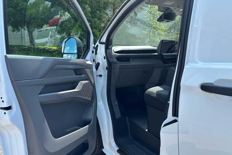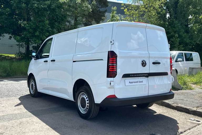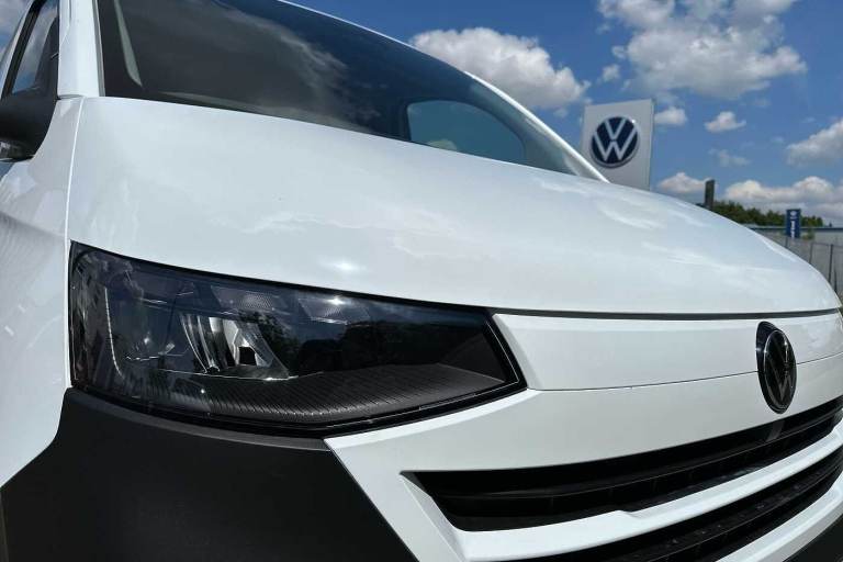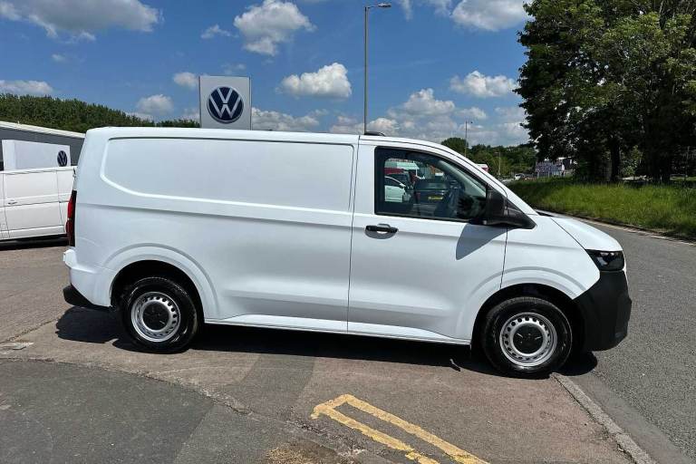 Available from 30/07/2025. Volkswagen Transporter T28 SWB Diesel 2.0 TDI 110 Commerce Plus Van in Clear White. Specification Includes Interior Features,Single zone air conditioning system with manual control in cab,Security,Keyless start with safelock,Doors,Rear wing doors,Paint - Solid,Solid - Clear white,Wheels,16in steel wheels with full wheel covers,Exterior Features,Heat reflecting side window glass,Body coloured door handles,Mud flaps front and rear,Rear Transporter nameplate in black grained decorative trim,Vehicle opening configuration 1x 1st row of seats- 2x all doors,Safety,Electronic stability control- ABS- ASR with deactivation button- hill start assist and brake assist system,Cruise control,Electromechanical speed sensitive power steering- height and longitudinally adjustable steering column,Lane assist,Wrong way driver warning,Driver and front passenger airbag with front passenger airbag deactivation,Dual tone horn,Front and curtain airbags for driver and front passenger,Seat belt pretensioner for driver seat,Audio / Communications,Apple CarPlay and Android Auto,4 speakers - 2x dashboard- 2x cab doors,Miscellaneous,12in digital drivers display,13in touchscreen infotainment display with wireless app connect and DAB radio,5G Modem,Dynamic road sign display,eCall emergency system,Preparation of VW connect and connect plus,Electrical,Alternator - 230A,Interior Features,2x 15-W USB data/charging ports in dashboard and 1x USB-C- 1x USB-A center bottom,3 spoke leather wrapped multi function steering wheel,Black plastic scuff plate for sliding door in cargo without illumination,Leatherette gear lever,Narrow centre console with cup holder and compartment for mobile phone,Overhead storage compartment,Roof grab handle on front passenger side,Rubber floor covering in cab,Striped fabric upholstery,Cabin interior lighting,Load Area,2x LED lights in load compartment,Lashing rings for reinforced floor covering,Without passenger seats in load compartment,Trim,4 way height and tilt adjustable head restraints,Security,Anti theft alarm system with interior monitoring in cab- backup horn and towing protection,Electronic immobiliser,Preparation for alcohol ignition interlock,Service/Warranty,5+ Promise.
