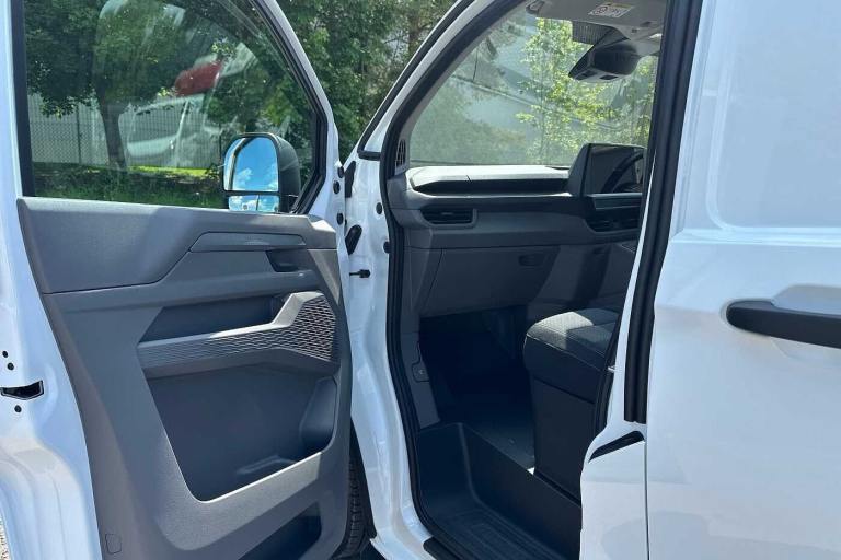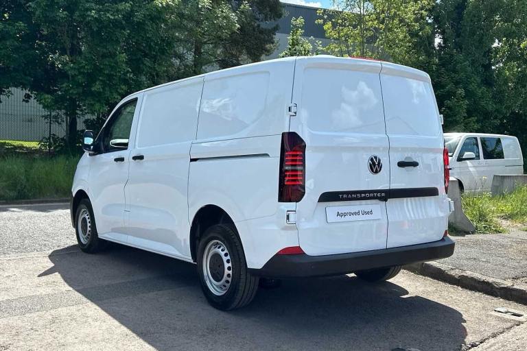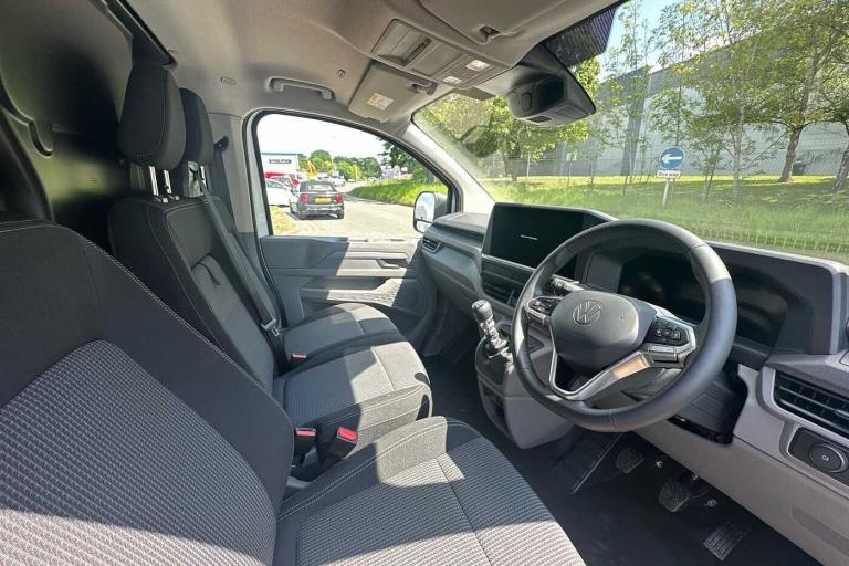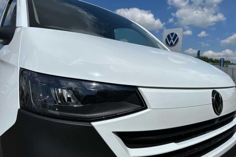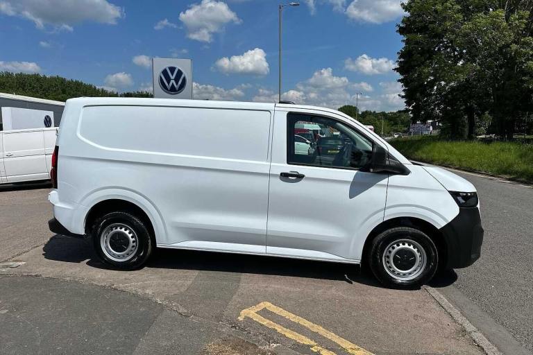 Available from 30/07/2025. Volkswagen Transporter T28 SWB Diesel 2.0 TDI 110 Commerce Plus Van in Clear White. Specification Includes Interior Features,Single zone air conditioning system with manual control in cab,Security,Keyless start with safelock,Doors,Rear wing doors,Paint - Solid,Solid - Clear white,Exterior Features,Heat reflecting side window glass,Body coloured door handles,Mud flaps front and rear,Rear Transporter nameplate in black grained decorative trim,Vehicle opening configuration 1x 1st row of seats- 2x all doors,Safety,Electronic stability control- ABS- ASR with deactivation button- hill start assist and brake assist system,Cruise control,Electromechanical speed sensitive power steering- height and longitudinally adjustable steering column,Lane assist,Wrong way driver warning,Driver and front passenger airbag with front passenger airbag deactivation,Dual tone horn,Front and curtain airbags for driver and front passenger,Seat belt pretensioner for driver seat,Audio / Communications,Apple CarPlay and Android Auto,4 speakers - 2x dashboard- 2x cab doors,Miscellaneous,12in digital drivers display,13in touchscreen infotainment display with wireless app connect and DAB radio,5G Modem,Dynamic road sign display,eCall emergency system,Preparation of VW connect and connect plus,Electrical,Alternator - 230A,Interior Features,2x 15-W USB data/charging ports in dashboard and 1x USB-C- 1x USB-A center bottom,3 spoke leather wrapped multi function steering wheel,Black plastic scuff plate for sliding door in cargo without illumination,Leatherette gear lever,Narrow centre console with cup holder and compartment for mobile phone,Overhead storage compartment,Roof grab handle on front passenger side,Rubber floor covering in cab,Striped fabric upholstery,Cabin interior lighting,Load Area,2x LED lights in load compartment,Lashing rings for reinforced floor covering,Without passenger seats in load compartment,Trim,4 way height and tilt adjustable head restraints,Security,Anti theft alarm system with interior monitoring in cab- backup horn and towing protection,Electronic immobiliser,Preparation for alcohol ignition interlock,Service/Warranty,5+ Promise.