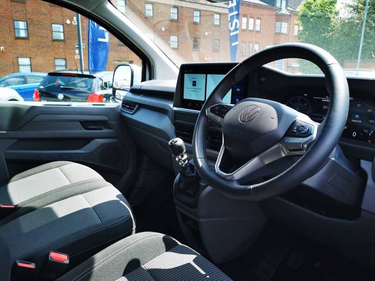 Available from 21/06/2025. Volkswagen Transporter T32 SWB Diesel 2.0 TDI 150 Commerce Plus Van in White. Specification Includes Exterior Features,Heat reflecting side window glass,Body coloured door handles,Mud flaps front and rear,Rear Transporter nameplate in black grained decorative trim,Vehicle opening configuration 1x 1st row of seats- 2x all doors,Safety,Electronic stability control- ABS- ASR with deactivation button- hill start assist and brake assist system,Cruise control,Electromechanical speed sensitive power steering- height and longitudinally adjustable steering column,Lane assist,Wrong way driver warning,Driver and front passenger airbag with front passenger airbag deactivation,Dual tone horn,Front and curtain airbags for driver and front passenger,Seat belt pretensioner for driver seat,Audio / Communications,Apple CarPlay and Android Auto,4 speakers - 2x dashboard- 2x cab doors,Miscellaneous,12in digital drivers display,13in touchscreen infotainment display with wireless app connect and DAB radio,5G Modem,Dynamic road sign display,eCall emergency system,Preparation of VW connect and connect plus,Electrical,Alternator - 230A,Interior Features,2x 15-W USB data/charging ports in dashboard and 1x USB-C- 1x USB-A center bottom,3 spoke leather wrapped multi function steering wheel,Black plastic scuff plate for sliding door in cargo without illumination,Leatherette gear lever,Narrow centre console with cup holder and compartment for mobile phone,Overhead storage compartment,Roof grab handle on front passenger side,Rubber floor covering in cab,Striped fabric upholstery,Cabin interior lighting,Load Area,2x LED lights in load compartment,Lashing rings for reinforced floor covering,Without passenger seats in load compartment,Trim,4 way height and tilt adjustable head restraints,Security,Anti theft alarm system with interior monitoring in cab- backup horn and towing protection,Electronic immobiliser,Preparation for alcohol ignition interlock,Service/Warranty,5+ Promise.