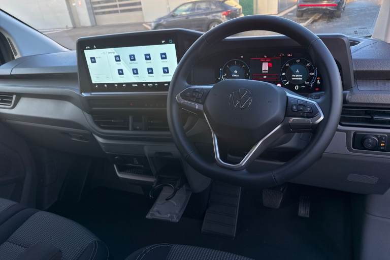 The Volkswagen T32 Panel Van Commerce Pro LWB 150 PS combines robust capability with modern comfort and cutting-edge technology. Finished in sleek Stone Grey with a smart Interior Transporter/Life trim, this long-wheelbase model offers generous cargo space while keeping driver comfort front and centre. Powered by a 2.0 TDI 150 PS engine with an 8-speed automatic gearbox, it delivers smooth, efficient performance for demanding workloads. Practical features like the rear tailgate, 16"" ""Montreal"" alloy wheels, and steel spare wheel ensure reliability for everyday use, while body-coloured bumpers, mirrors, and handles give it a polished, professional appearance. Inside, enjoy heated individual cab seats, a multi-function leatherette steering wheel, single-zone automatic air conditioning, and ample storage, including a load-through bench with fold-out table. Advanced tech includes the Parking Package Premium with front and rear sensors, rear view camera, adaptive cruise control with predictive speed limiter, Dynamic Road Sign Display, and Dynamic LightAssist high-beam control. Wireless App-Connect, USB-C charging ports, and a heated windscreen keep you connected and comfortable on the move. Safety is paramount with front and curtain airbags, Lane Assist, Blind Spot Assist, and a reinforced 3.2 t gross vehicle weight rating. The T32 Commerce Pro LWB is built to be a dependable, versatile, and stylish workhorse, perfect for businesses needing a van that performs as hard as you do...
