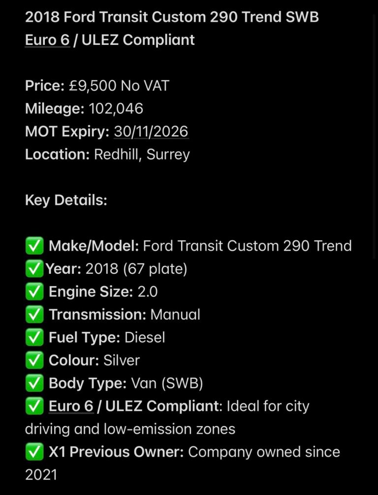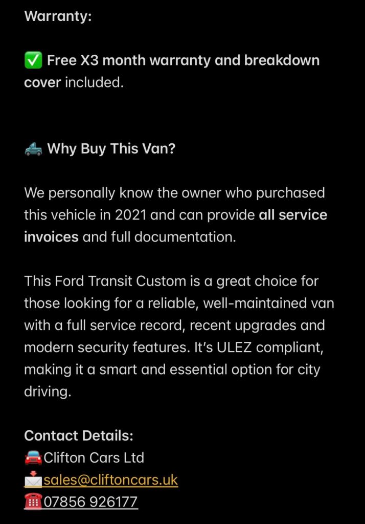 This Ford Transit Custom is a great choice for those looking for a reliable, well-maintained van with a full service record, recent upgrades and modern security features. It’s ULEZ compliant, making it a smart and essential option for city driving.